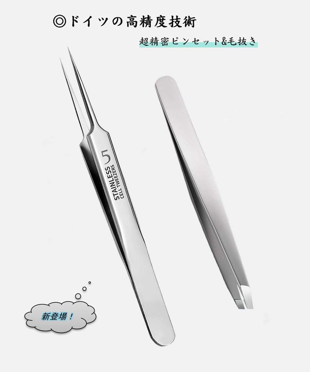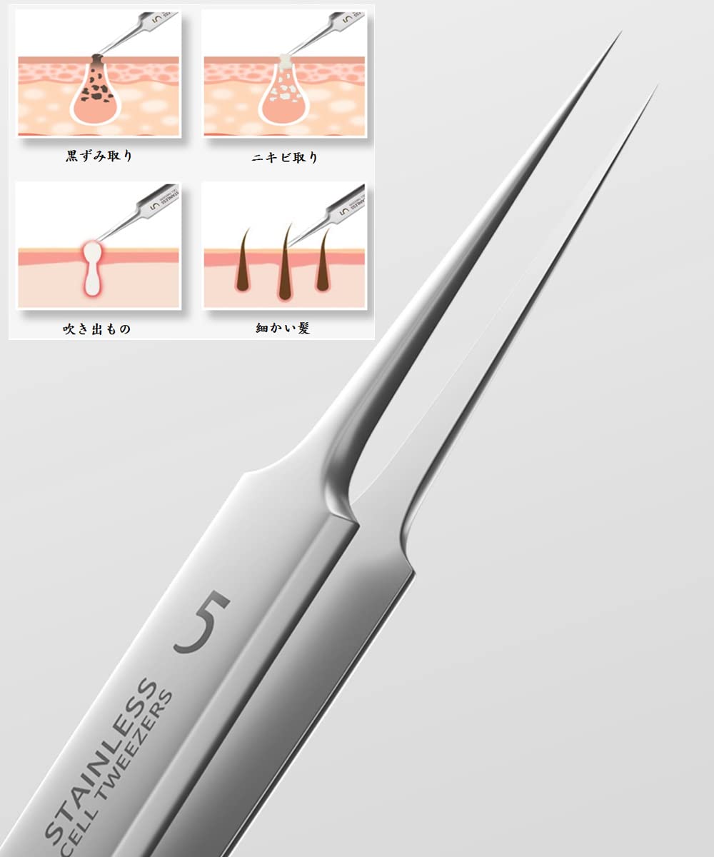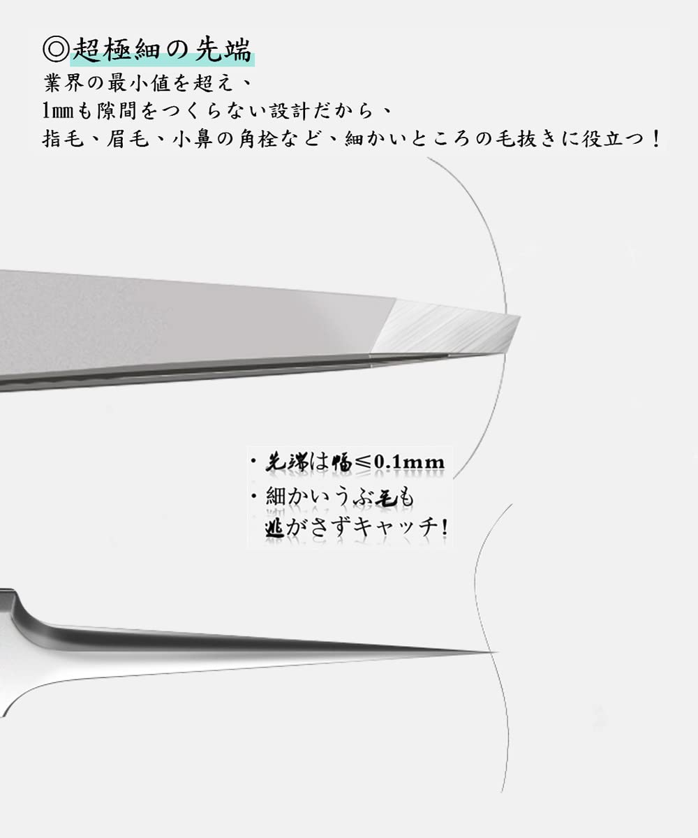 【超極細の先端】ドイツの精工技術を採用されており、業界の最小値を超え、角栓ピンセットの先端幅は0.1mmです。毛抜きピンセットは超薄型の先端を持ちます、業界トップ!「安全に保管できるため、先端にはめるキャップがついています」
