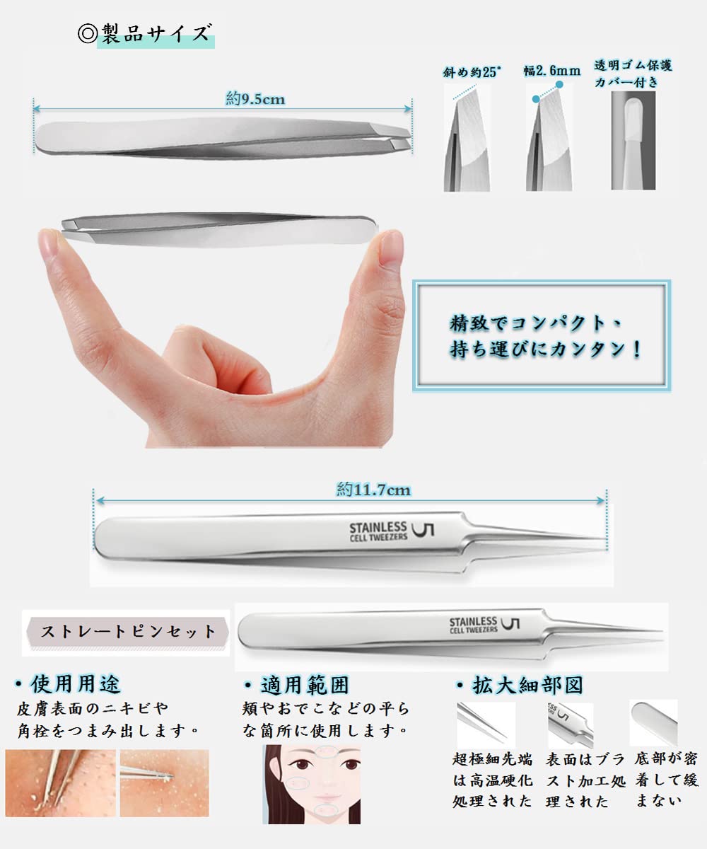 角栓ピンセット 毛抜きピンセット (先斜め) 極細先端幅は0.1mm 精密ピンセット 角栓取り かくせんとり 黒ずみ取り 収納ケース付き 2本セット