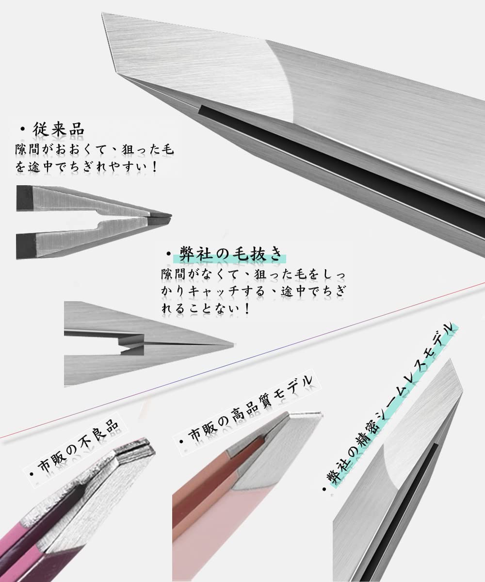 【かみ合わせピッタリ】細かく調整された先端を、手作業で磨き、隙間なくしっかりと咬み合わせ、お肌にやさしい刃先へと仕上がっています。また、お肌にだけではなく、抜く毛にも優しい刃先で、細かなうぶ毛も途中でちぎれることなく、スッと抜くことができます。