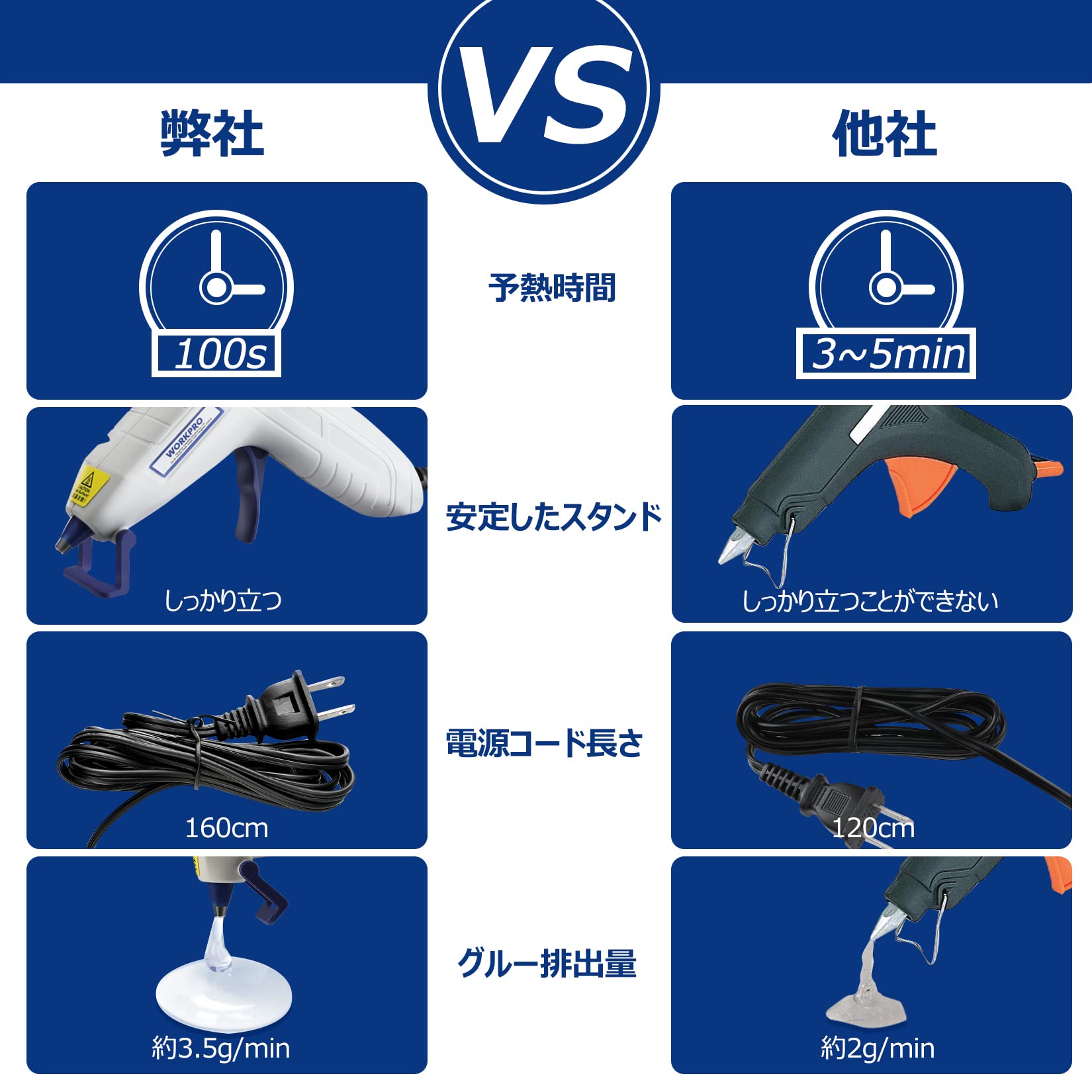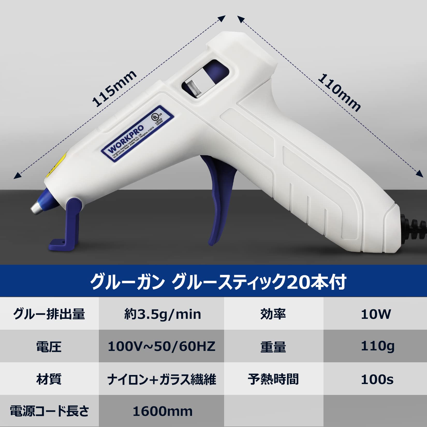 【製品仕様】パッケージ内容物:グルーガン*1、スティック*20本。本体サイズ:115*110mm。重量:110g。グルー排出量:約3.5g/min。普通のグルーガン(1分間で約2g)より倍ぐらいなるので作業効率を上げます。