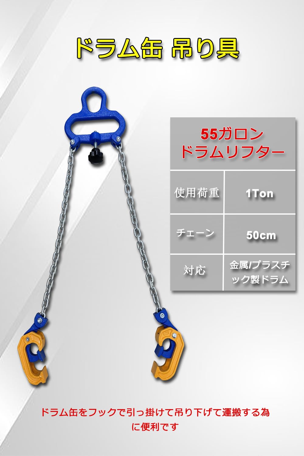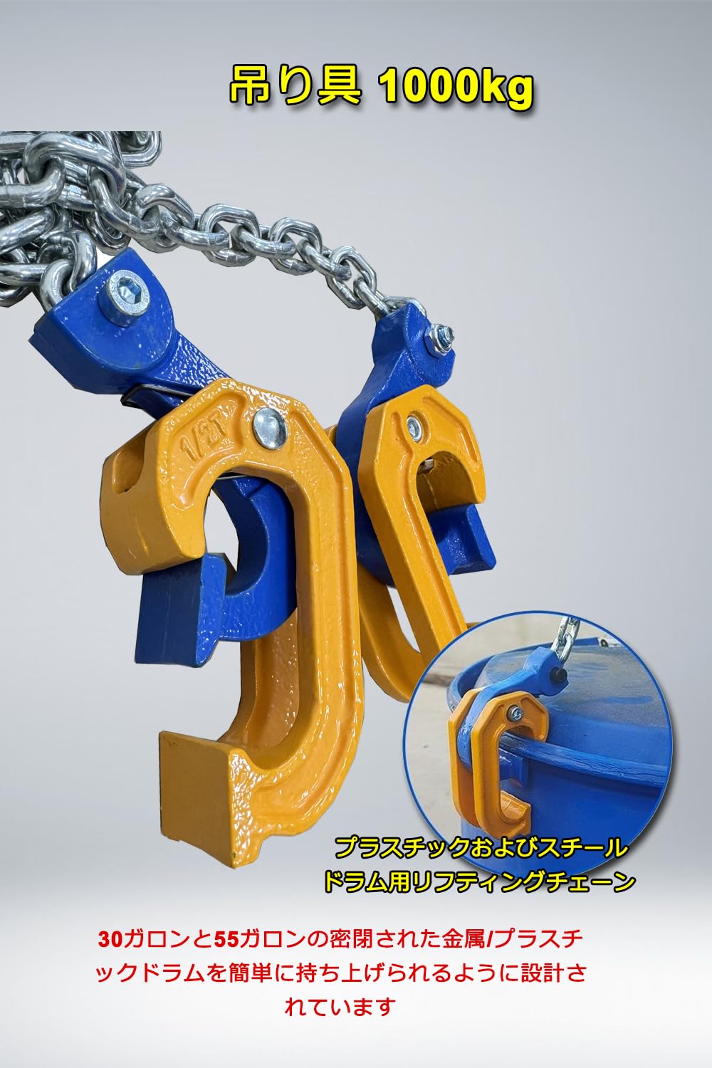 【チェーン式のドラム缶リフター】使用荷重: 500kg(シングル)/ 1000kg(ダブル)。ワンタッチグリップで簡単にドラム缶に設置できます。