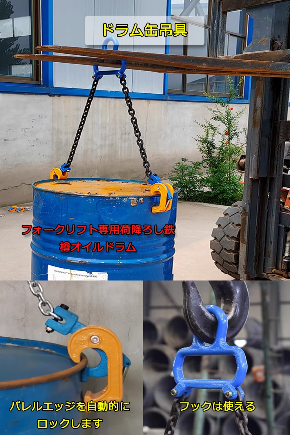 【マルチリング式 ドラム缶リフター 】ドラム缶をフックで引っ掛けて吊り下げて運搬する為に便利、作業効率も大幅にUPします!!