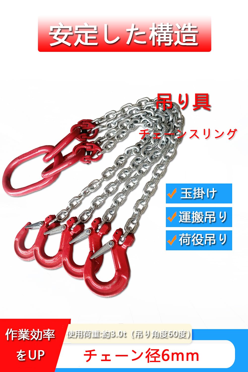 チェーンスリング3t 1.5m 4本吊り チェーン径6mm 吊りクランプ・吊りベルト チェーンブロック スリングフック【耐荷重3.0T】