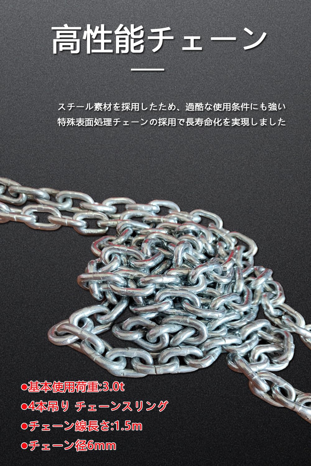 【強靭性・摩耗性に富み】合金鋼材質G80で作られたチェーン、チェーンの表面には亜鉛メッキが施されで長寿命化を実現しました。