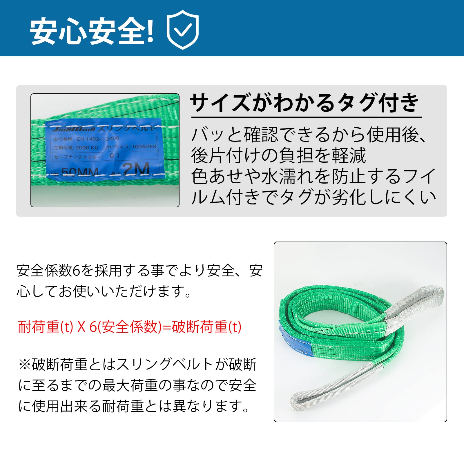 【商品仕様】■全長:2M ■ベルト幅:50mm ■緑 最大使用荷重:2000kg (ストレート吊の場合) ■安全係数:6