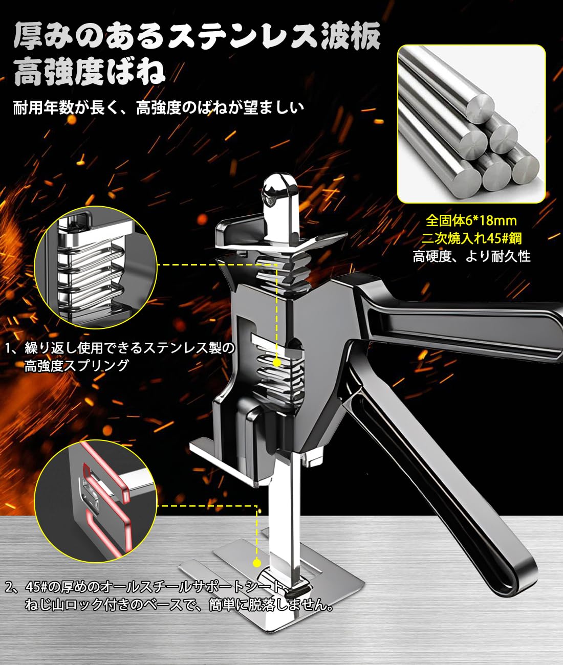 【高耐久性と安全性】 当社のジャッキスタンドツールは、高品質のS45C炭素構造鋼を採用しており、最大耐荷重は220kgに達します。左右の高さを簡単に揃えられる目盛り付きの2ピース併用です。この汎用性の高いリフト アームは、単なる乾式壁リフト ツールではなく、シンプルなロックおよびリリース メカニズムとスムーズで制御された下降により、設置中に正確なレベルを維持するのに役立ちます。強度と耐久性に優れ、重い荷物を安全に持ち上げることができます。加え、安定感があり、使用時の危険を最小限に抑えます。