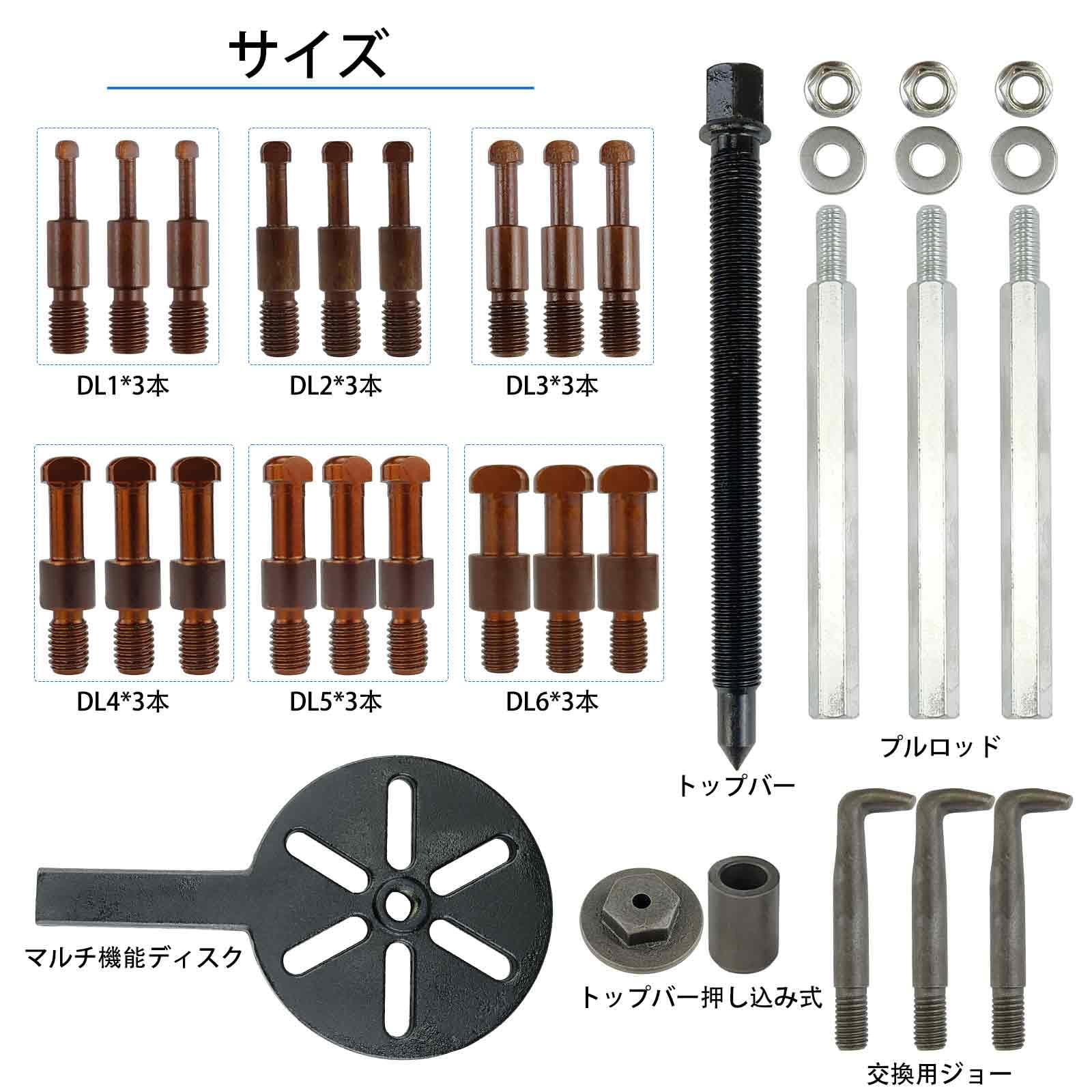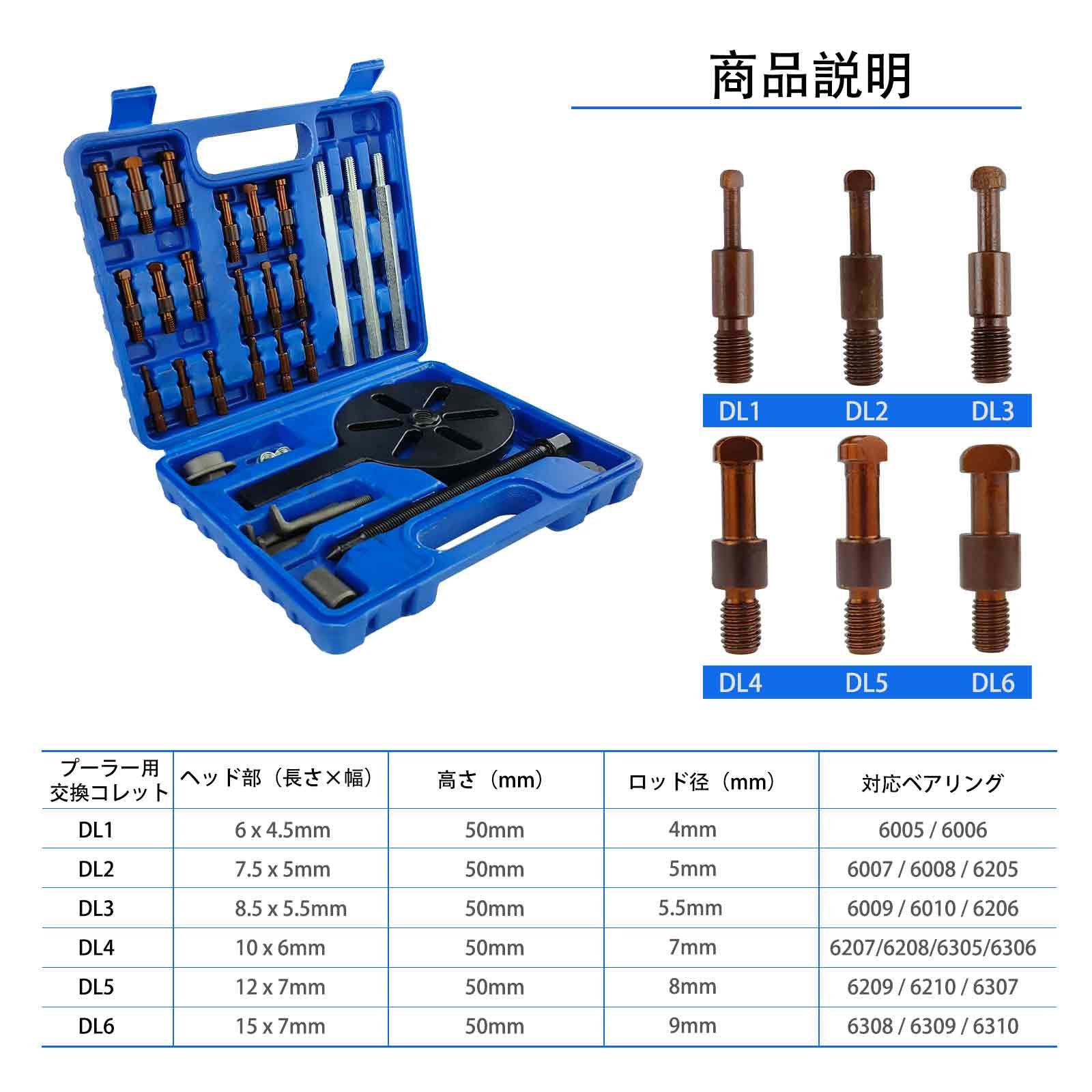 21点セットで幅広い作業に対応-6種類のコレットサイズと3つの追加フック付き,DL1〜DL6プーラーヘッドと組み合わせて、様々なベアリング脱着作業を効率的に行えます。