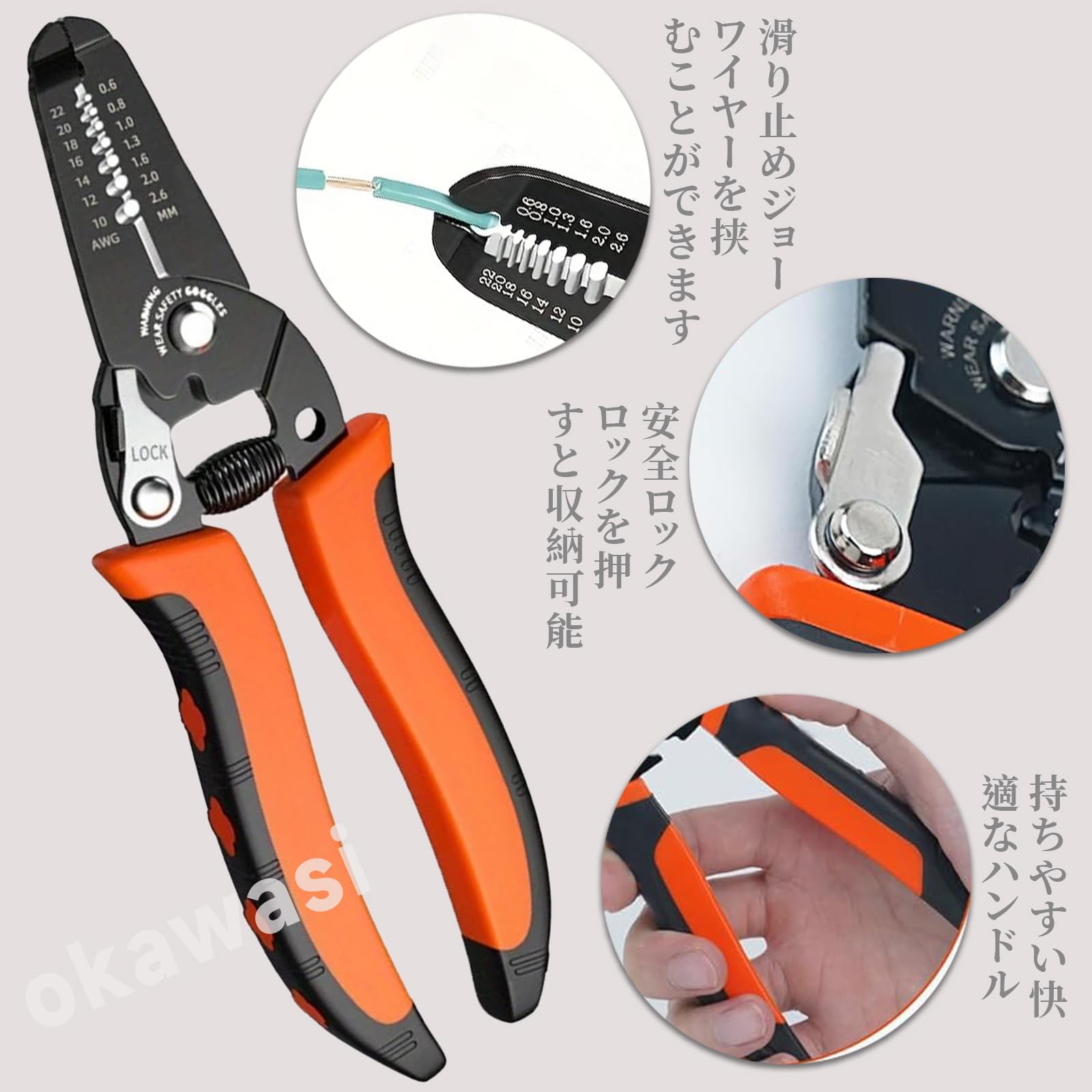 【安全性と信頼性】ワイヤーストリッピングツールには安全ロックが付いており、不要なときに誤って怪我をしないよう、鋭利な面をしまうことができます。 また、ハンドル部には特殊な滑り止めパターンを採用。汗や油の付着時でもしっかり握れて、作業中の安全性と安定性を確保します。