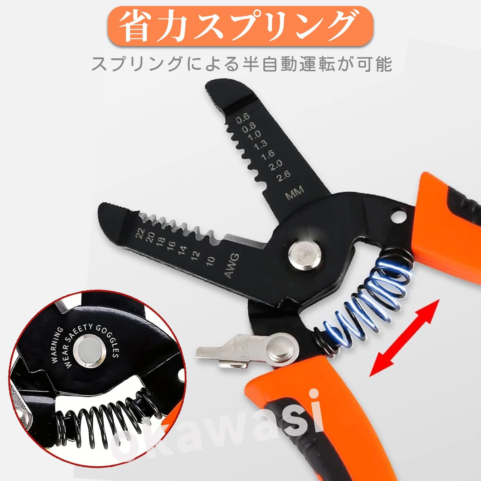 【人間工学に基づくコンフォート設計】省力スプリング搭載、ハンドルに内蔵された省力スプリングが自動的に開く動作をアシスト。繰り返し作業でも手の疲労を大幅に軽減します。ハイレバレッジ & コンフォートハンドル、最小限の力で大きな切断力・圧着力を発揮するハイレバレッジ設計。