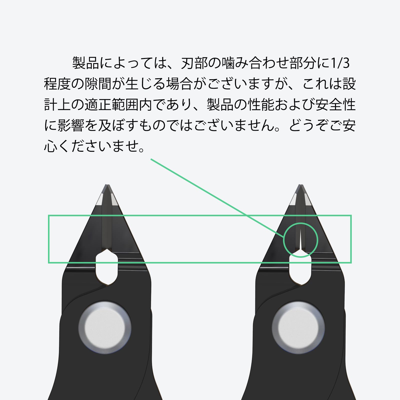 製品によっては、刃部の噛み合わせ部分に1/3程度の隙間が生じる場合がございますが、これは設計上の適正範囲内であり、製品の性能および安全性に影響を及ぼすものではございません。どうぞご安心くださいませ