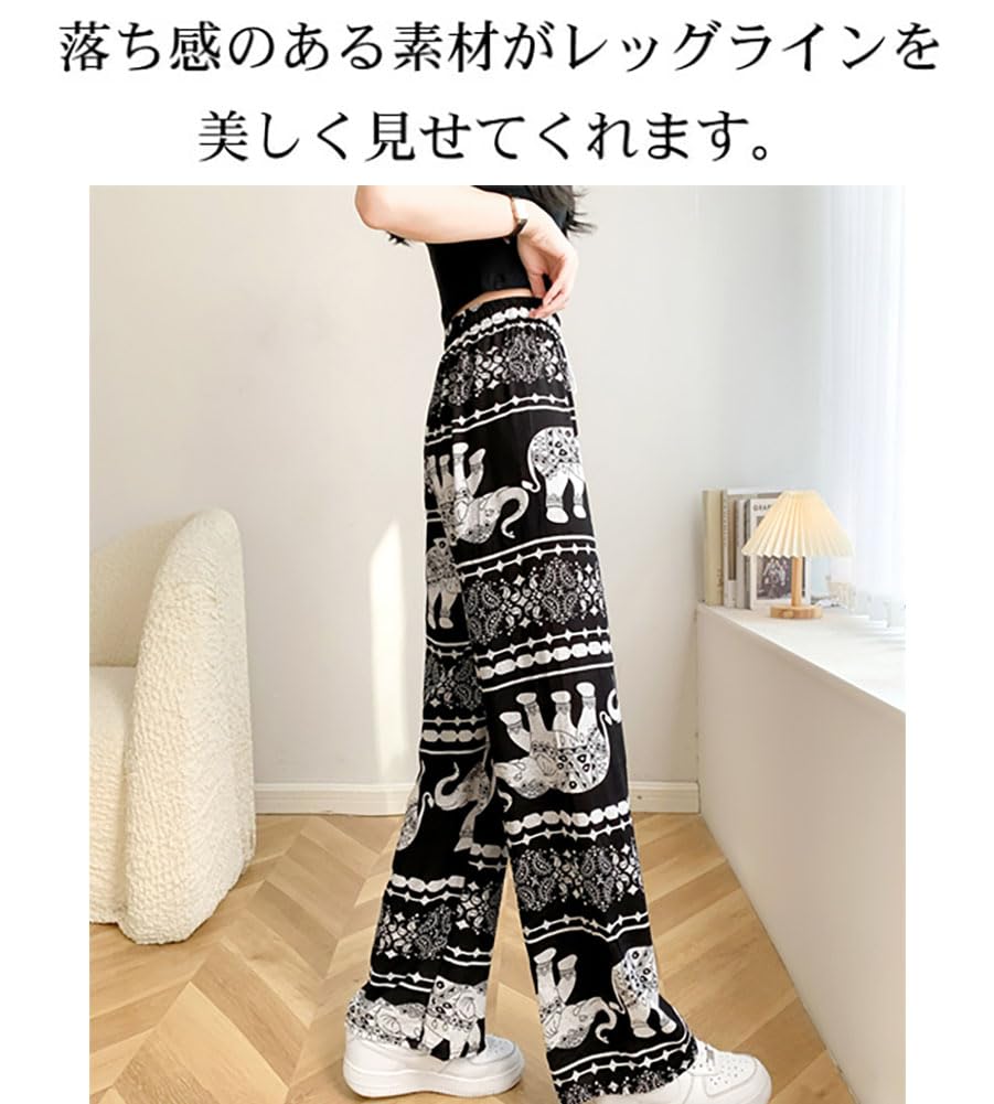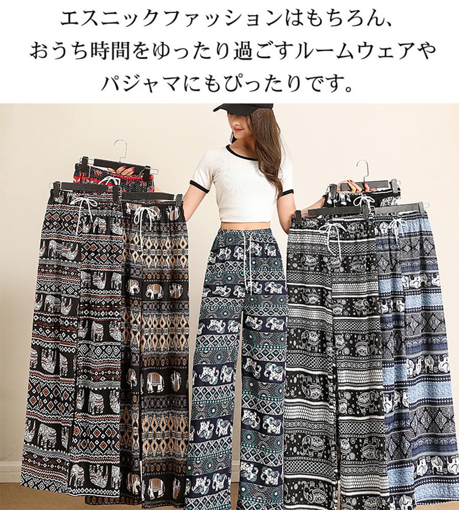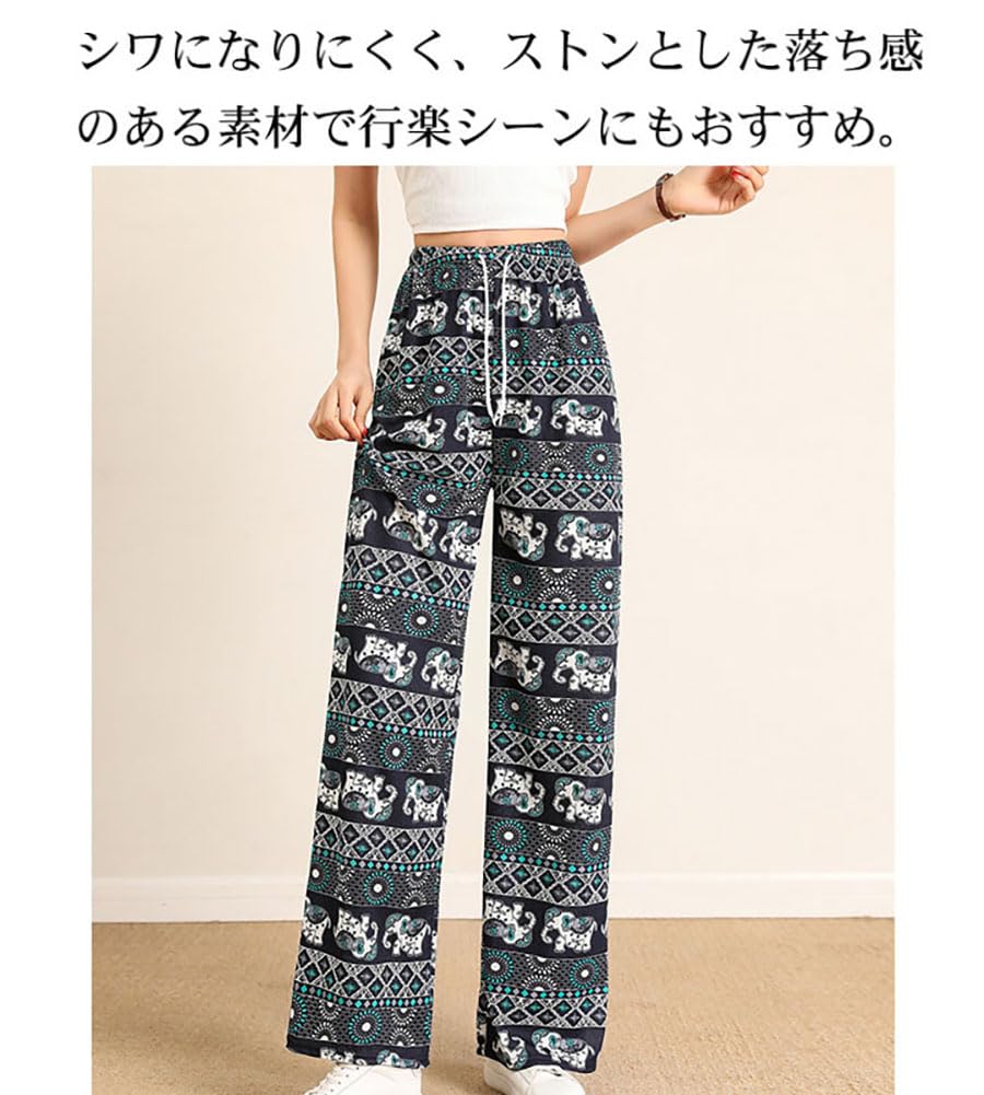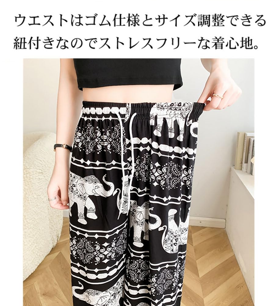 [Celetree] ワイドパンツ ロングパンツ レディース ウエストゴム 象 総柄 エスニック アジアン 薄手 涼しい 春 夏