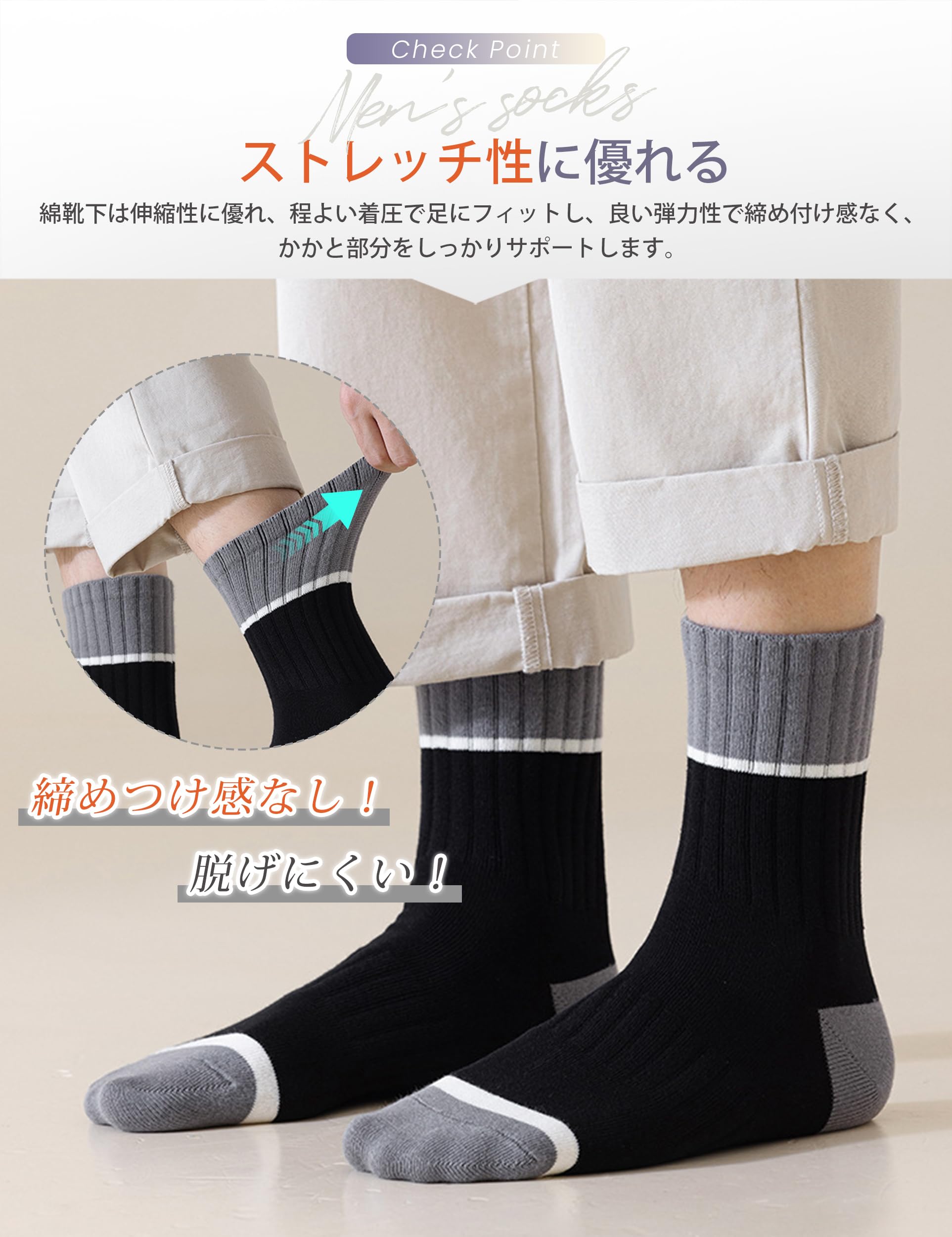 ??【三重脱げ防止&締め付けない】SLEEPSINEROのメンズソックスは三重脱げ防止加工されております。? まず、綿靴下は伸縮性に優れ、程よい着圧で足にフィットし、脱げにくいです。??また、足の甲/土踏まず部分はリブ編みになっており、フィット感をもっと向上してくれ、靴内の摩擦による脱げを防止できます。??さらに、履き口部分もリブ編みで、走行中のずれ落ち・脱げを減少できます。良い弾力性で締め付け感なく、かかと部分をしっかりサポートし、運動用も疲れが溜めない履き心地良いスポーツソックスです。