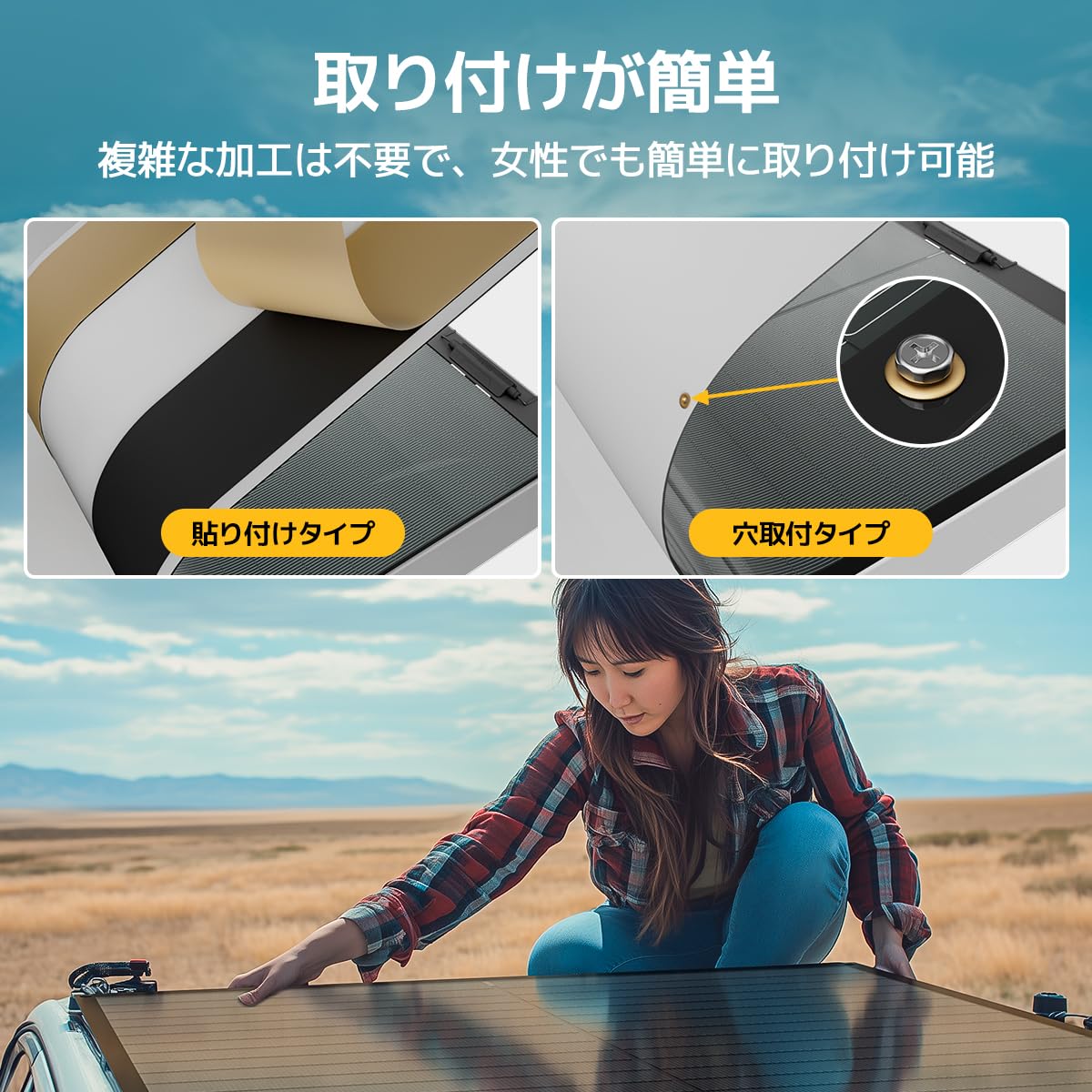 4.【設置しやすさ】ソーラーパネルは、貼り付けと穴取り付け2タイプがあり、設置がとても簡単です。貼り付けタイプは平らな表面に貼るだけで迅速に設置でき、穴取り付けタイプはボルト固定で長期使用に適しています。また、別売りのMC4圧着工具セットもあり、効率的な設置をサポートします。
