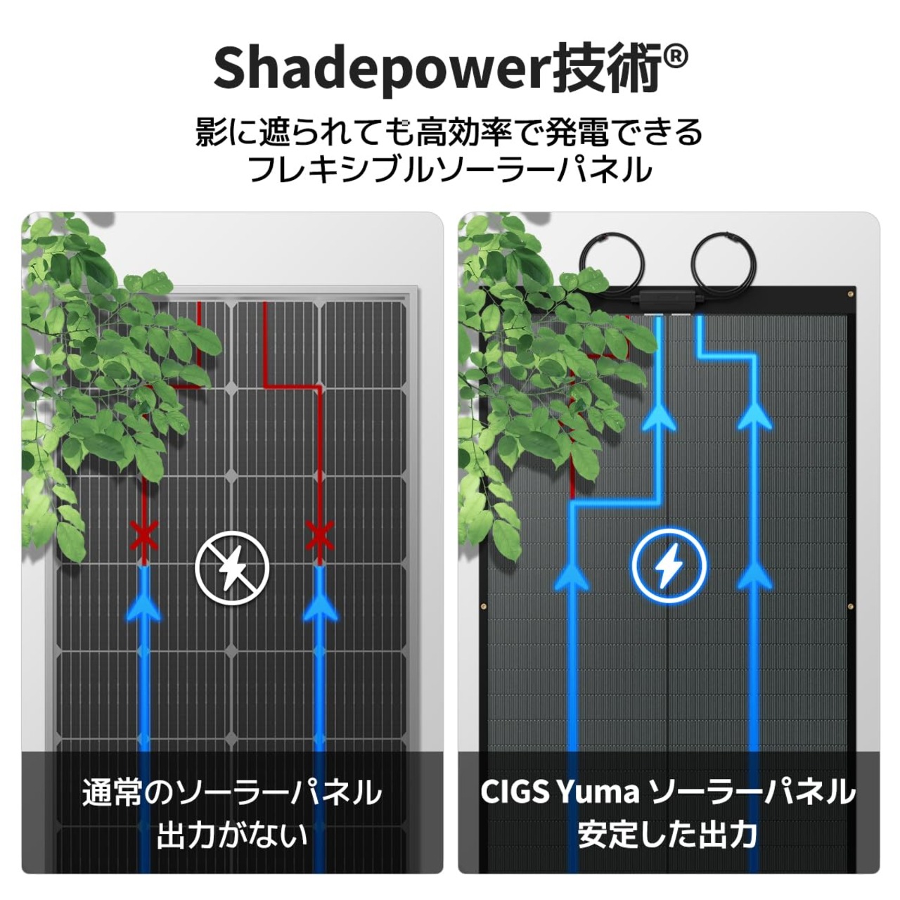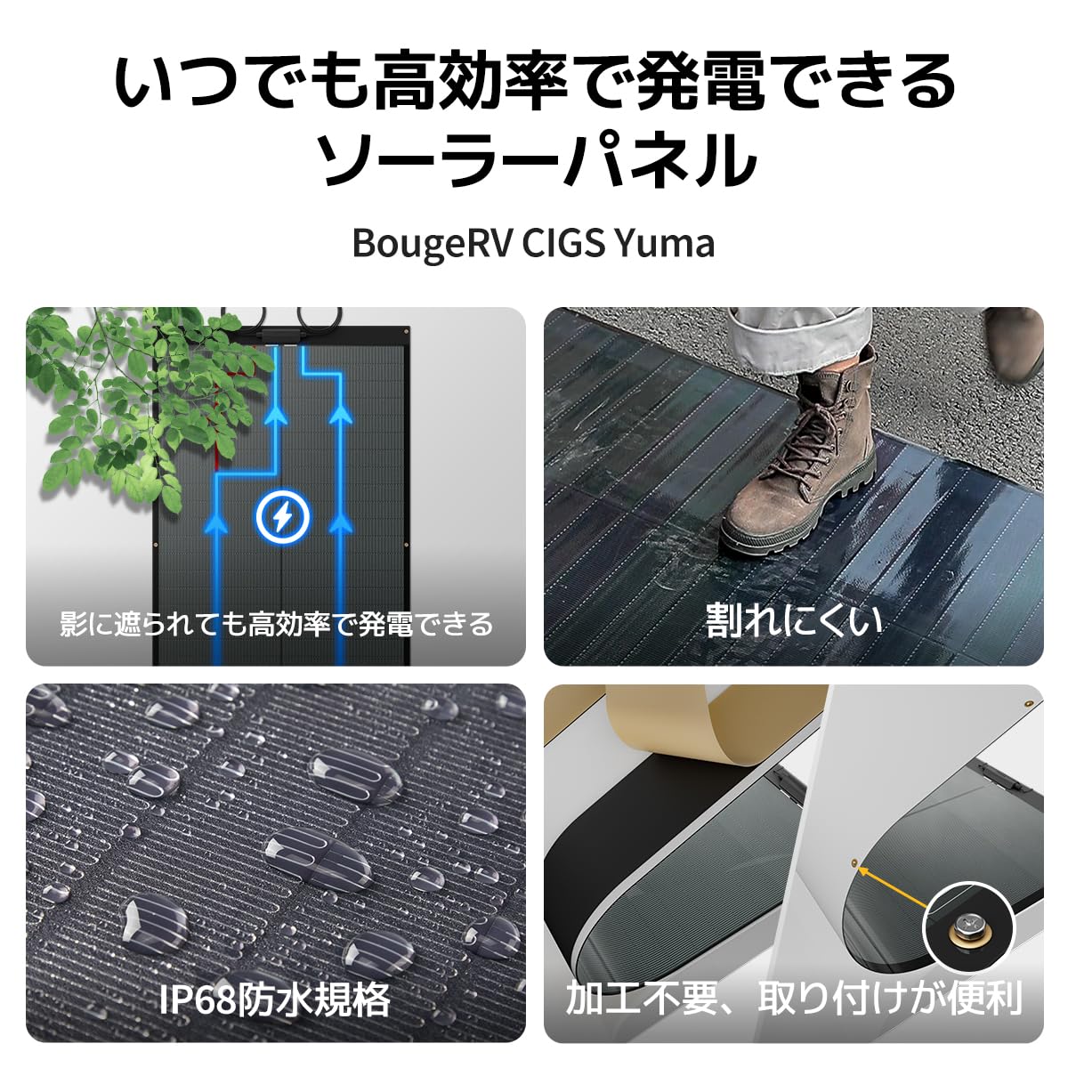 1.【発電効率が安定】BougeRV CIGS系太陽光発電パネルは、独自のShadepower技術により各セル間にバイパスダイオードを配置し、一部が影に隠れても残りは正常に出力します。これによりホットスポット現象による発火を回避し、安全で安心な発電を実現します。