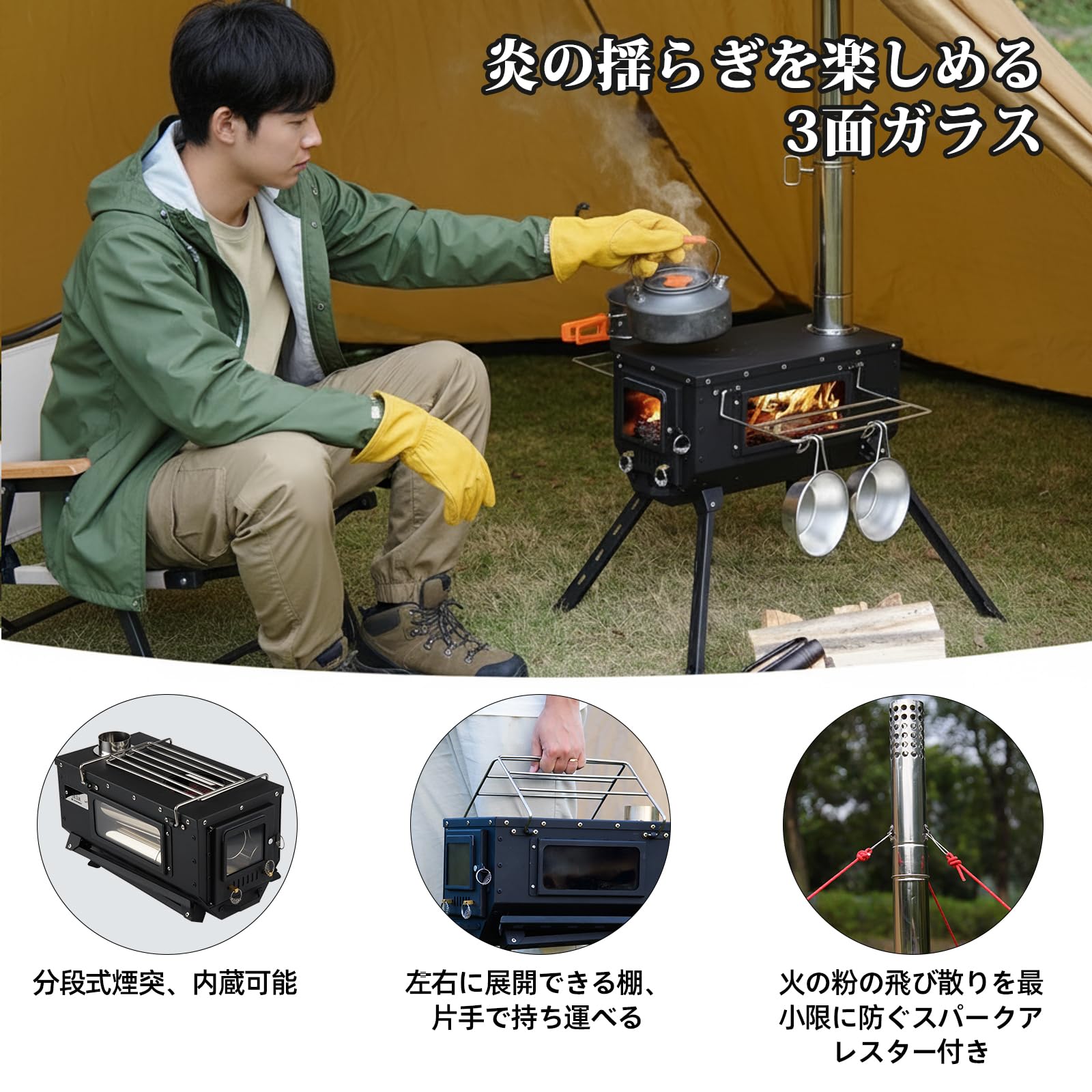 ??【3面ガラス窓で炎を楽しめる】: 前面と両側面にガラス窓を設置しており、テント内で暖を取るだけでなく、美しい炎を眺めることができるテントストーブです。耐熱ガラスを使用しており、どの方向からでも炎の美しさに癒されます。
