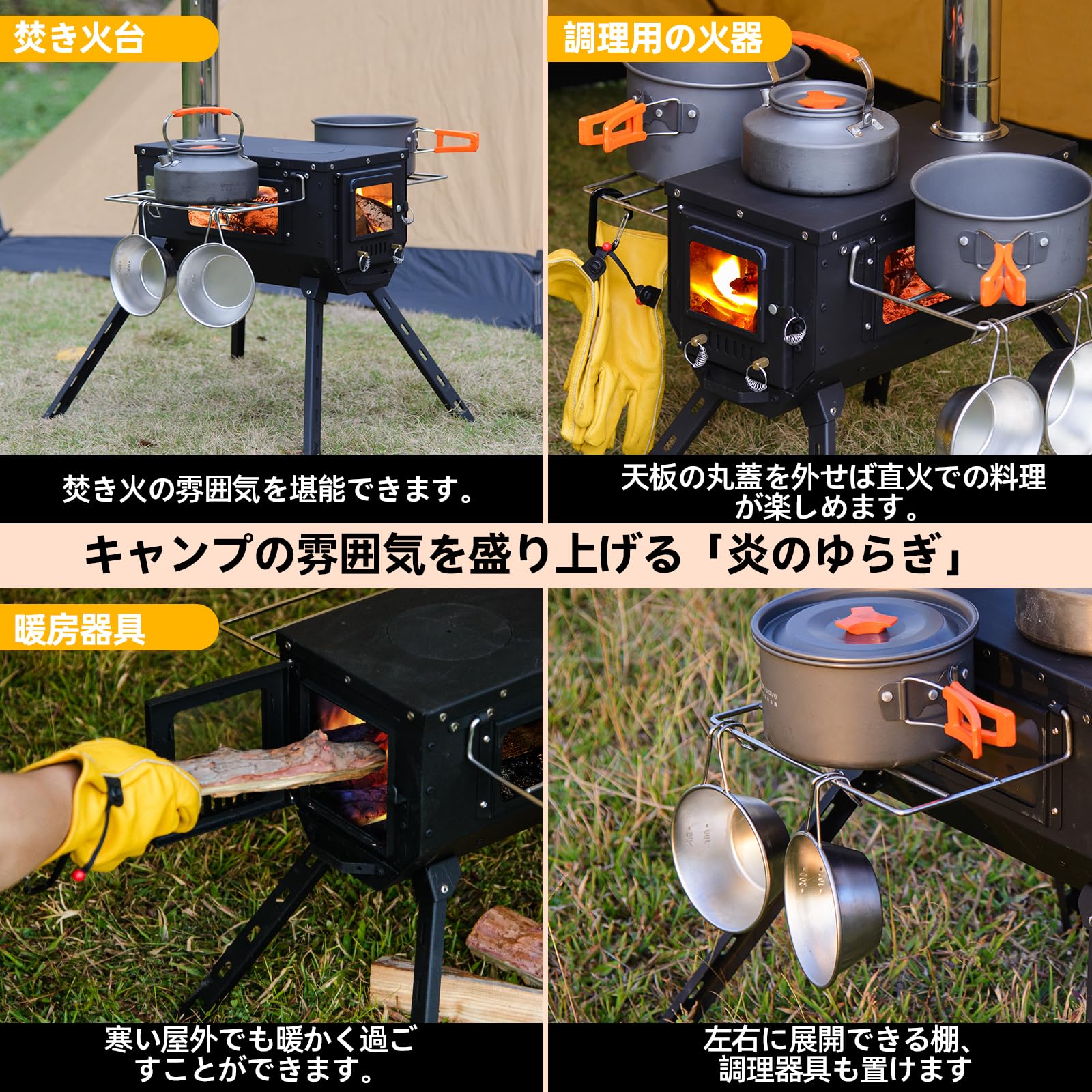 ??【持ち運びに便利・コンパクト設計】:① 煙突やパーツはすべて本体内部に収納可能です。② 薪ストーブのスタンド脚は本体と一体化した折りたたみ式で、持ち運びが簡単です。③ ストーブの両側には棚が展開でき、調理中の料理や食材の保温などにも便利です。