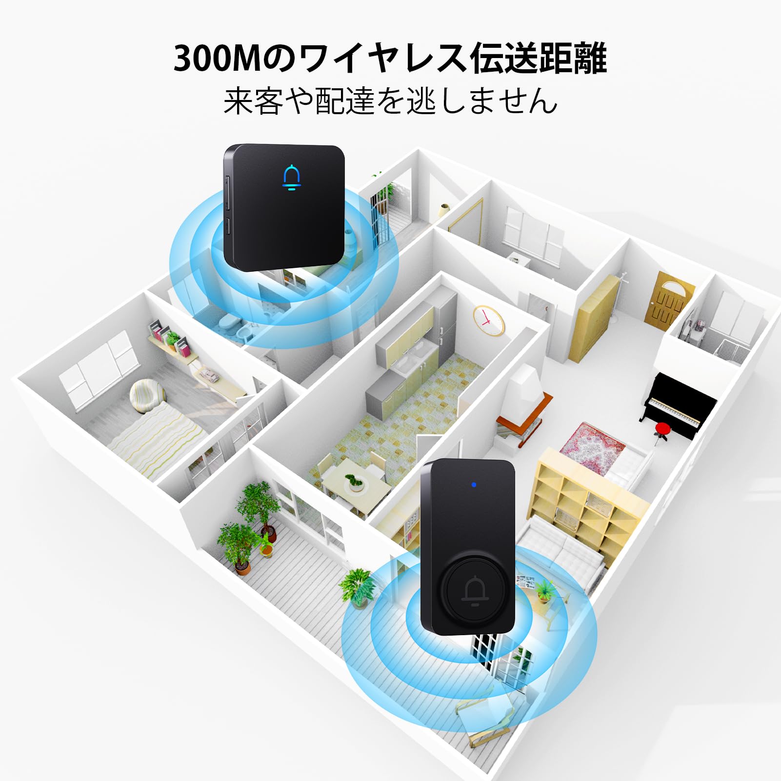 [長距離の通信範囲] このワイヤレスドアチャイムは300mの長距離通信能力を持つため、上階や裏庭にいても来客に気づかないことがありません。