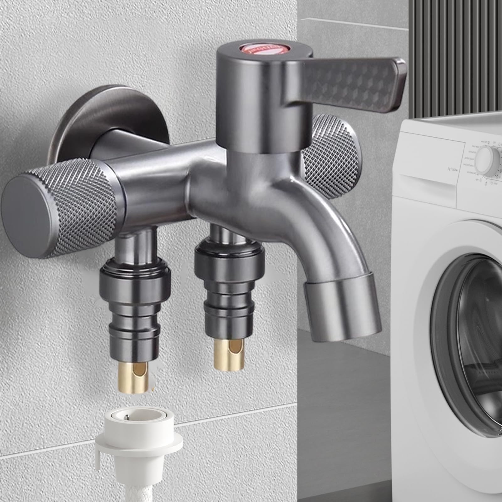 水栓 三口水栓 三方向分水栓 洗濯機+散水ホース+ガーデニング同時接続|ステンレス製 防錆|G1/2汎用口+自動止水ジョイント 壁付け取付穴φ20mm