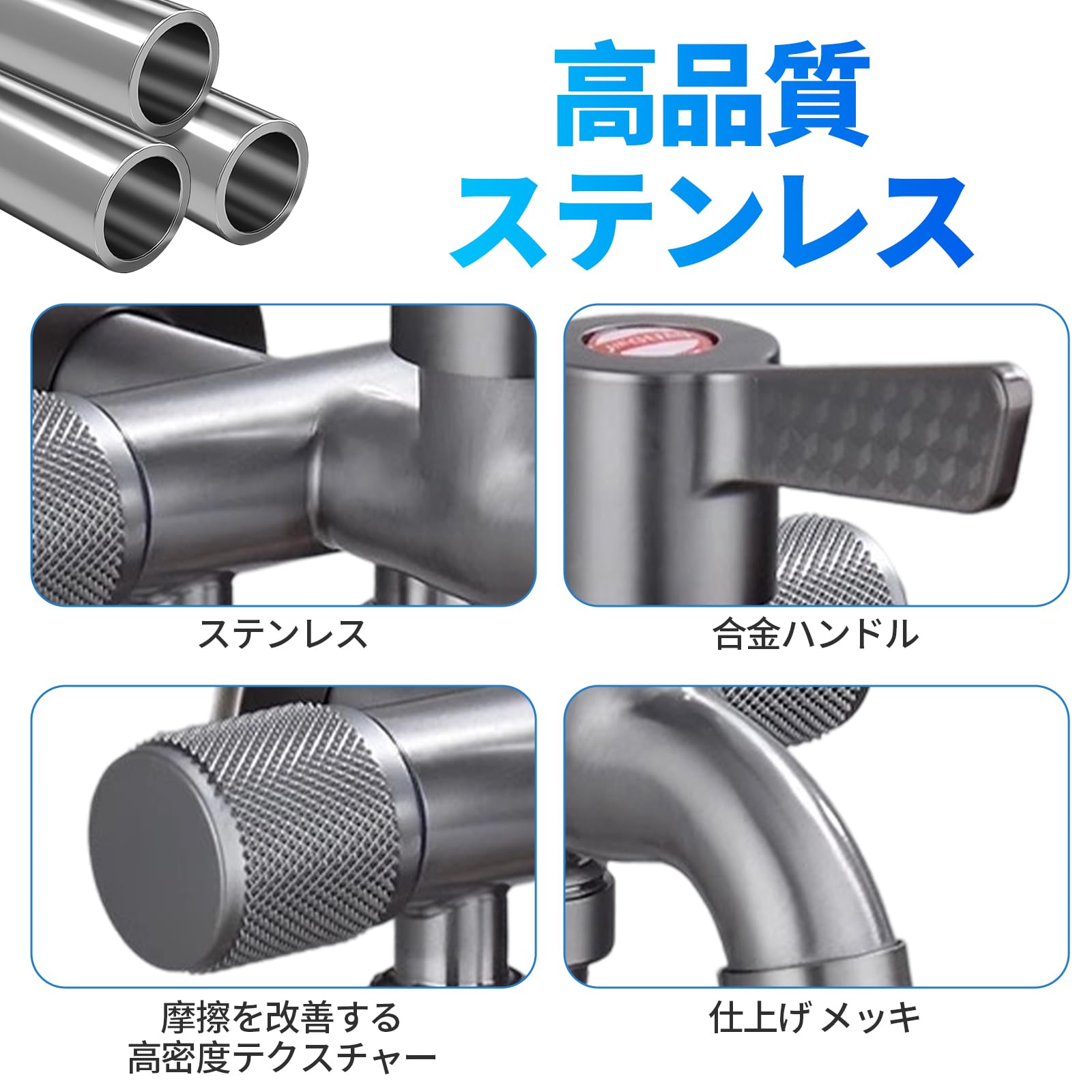 【表面処理】高品質のステンレス鋼で作られたこの3分岐蛇口 は、表面処理に水メッキを使用しており、表面の錆び、耐酸化性、耐食性、耐摩耗性を効果的に防止し、製品の寿命を延ばします。また、この蛇口三股はパイプ肉厚を厚くしてありますので、寒冷地でも使用可能です。精鋳一体成型鋳造、上?なバルブのコアスイッチ、水漏れなく、最高の防?、高?度、?がなく、非常に耐久性があります。