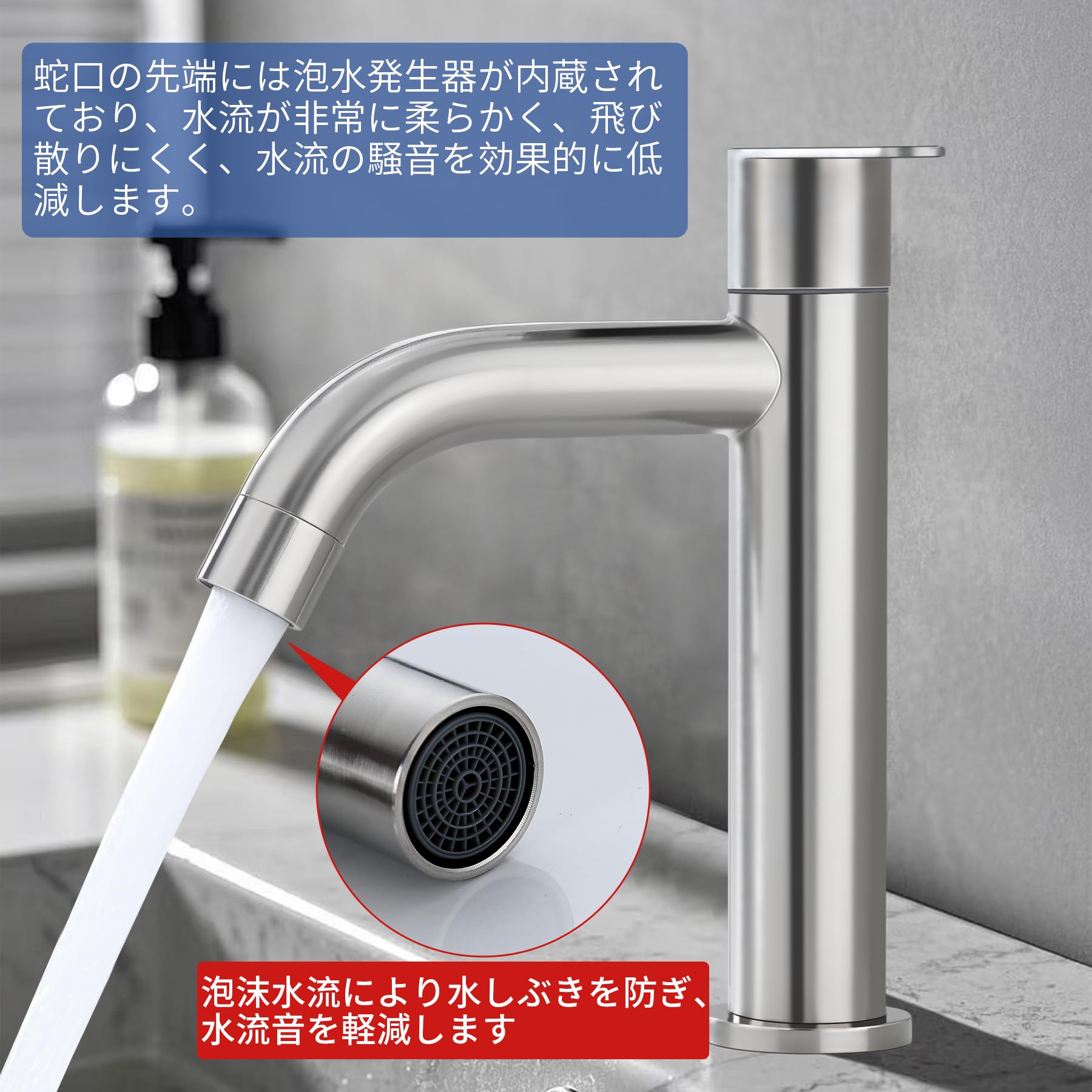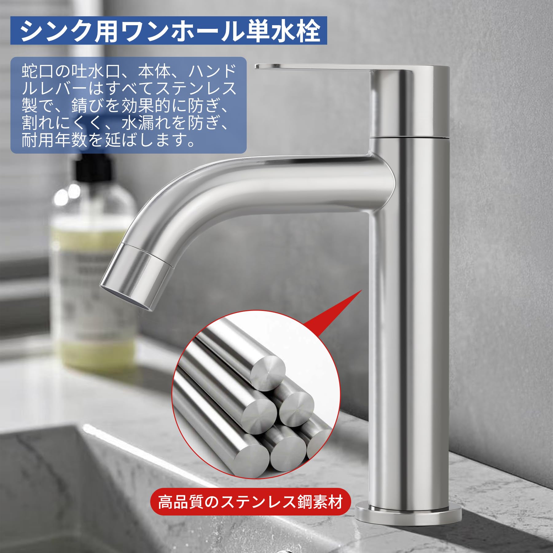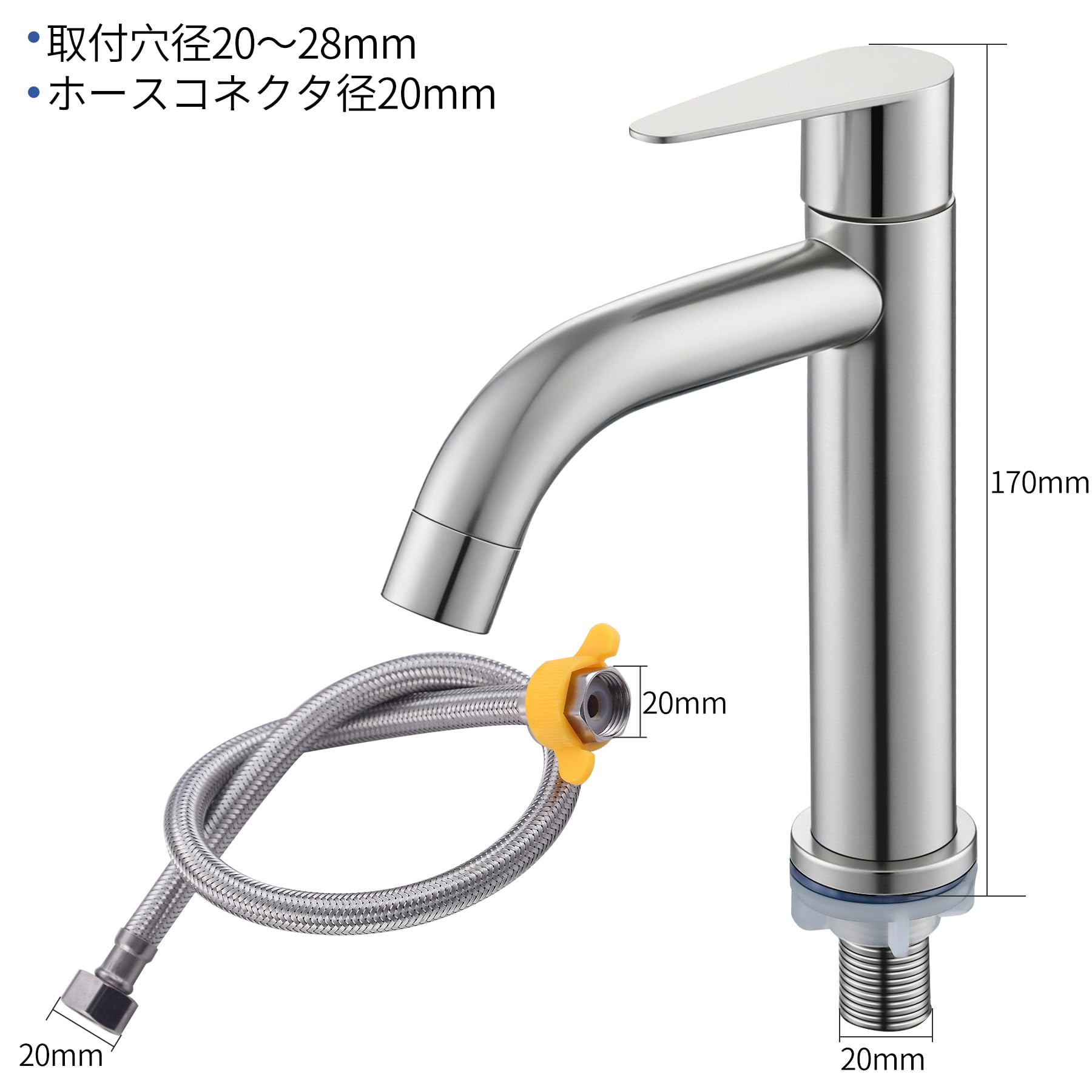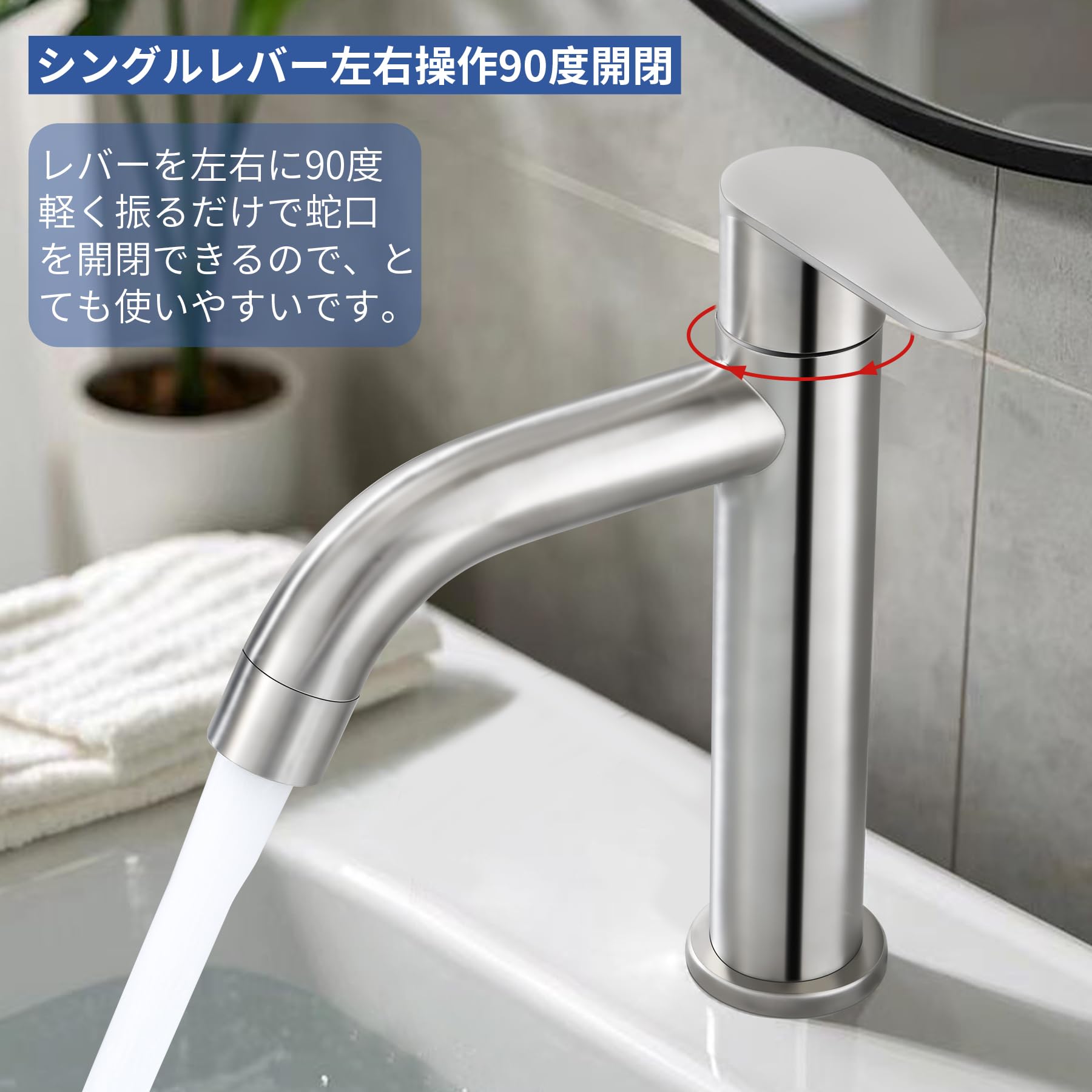 洗面台 蛇口 単水栓 シングルレバー 立水栓 トイレ 手洗い 蛇口 1穴 手洗いボウル 水道 洗面所 水栓 節水 SUS304ステンレス製 60cmホース付き 高さ17cm