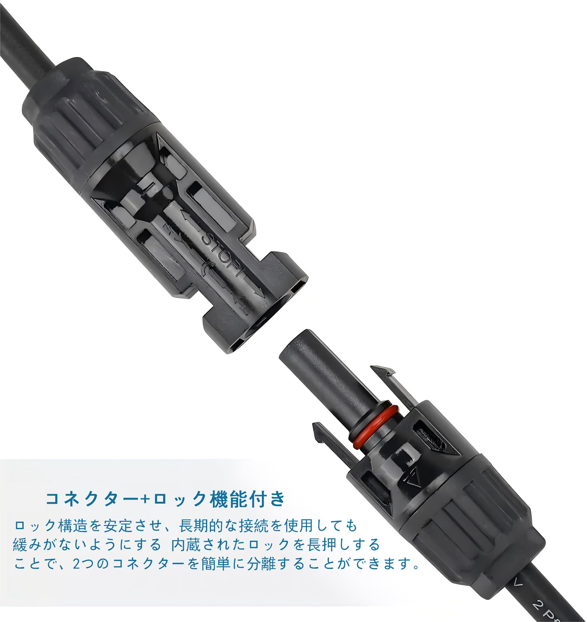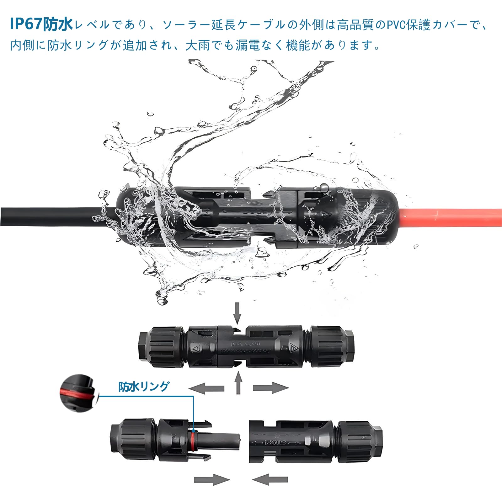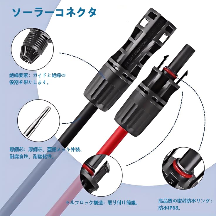 簡単で安心に使用:ソーラーコネクタには、湿気や粉塵の侵入を防ぐための防水リングが装備されており、IP等級「IP67」に準拠しております。必要に応じてオスとメスのコネクタを接続し、ケーブルの一端をソーラーパネルと並列に接続し、もう一端をソーラー充電コントローラーに接続するだけで、操作は非常に簡単で、安心して使用できます。