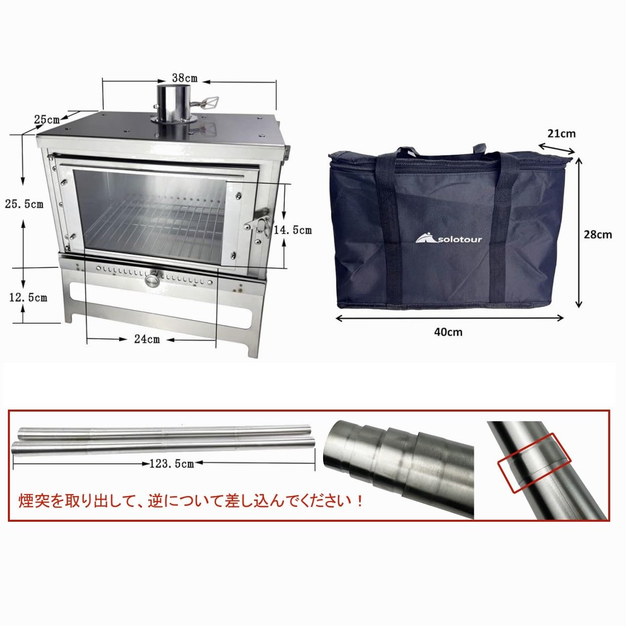 【在庫処分】solotour 【二次燃焼】ガラス 薪ストーブ 組み立て コンパクト スパークアレスター ダンパー付煙突*収納バッグ付き サイズ 38*25*25