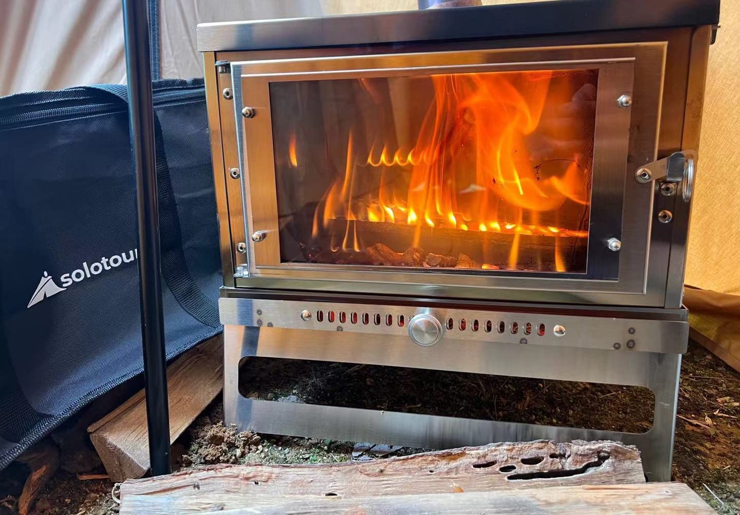 solotour 【二次燃焼】ガラス 薪ストーブ 組み立て コンパクト スパークアレスター ダンパー付煙突*収納バッグ付き サイズ 38*25*25