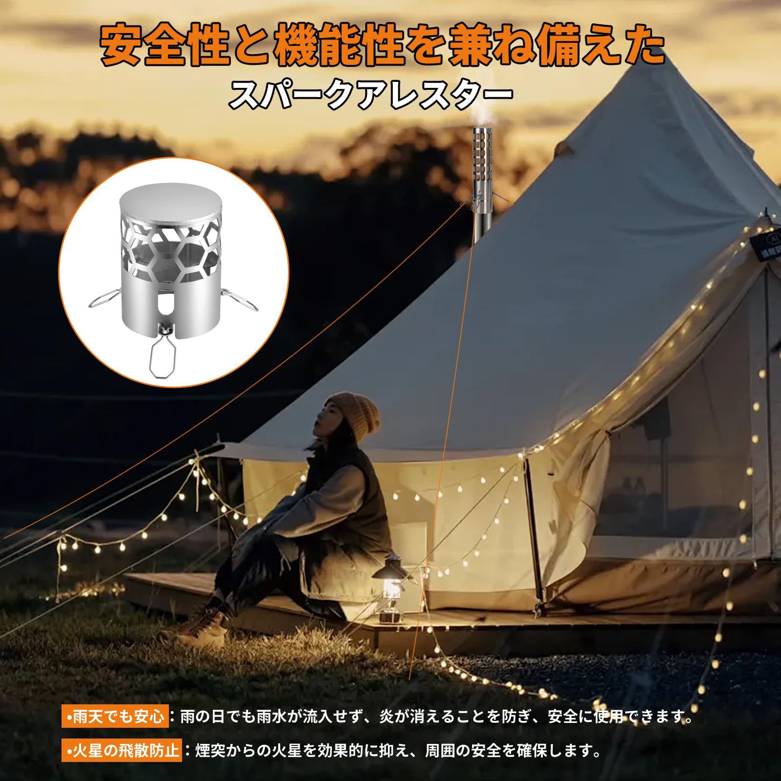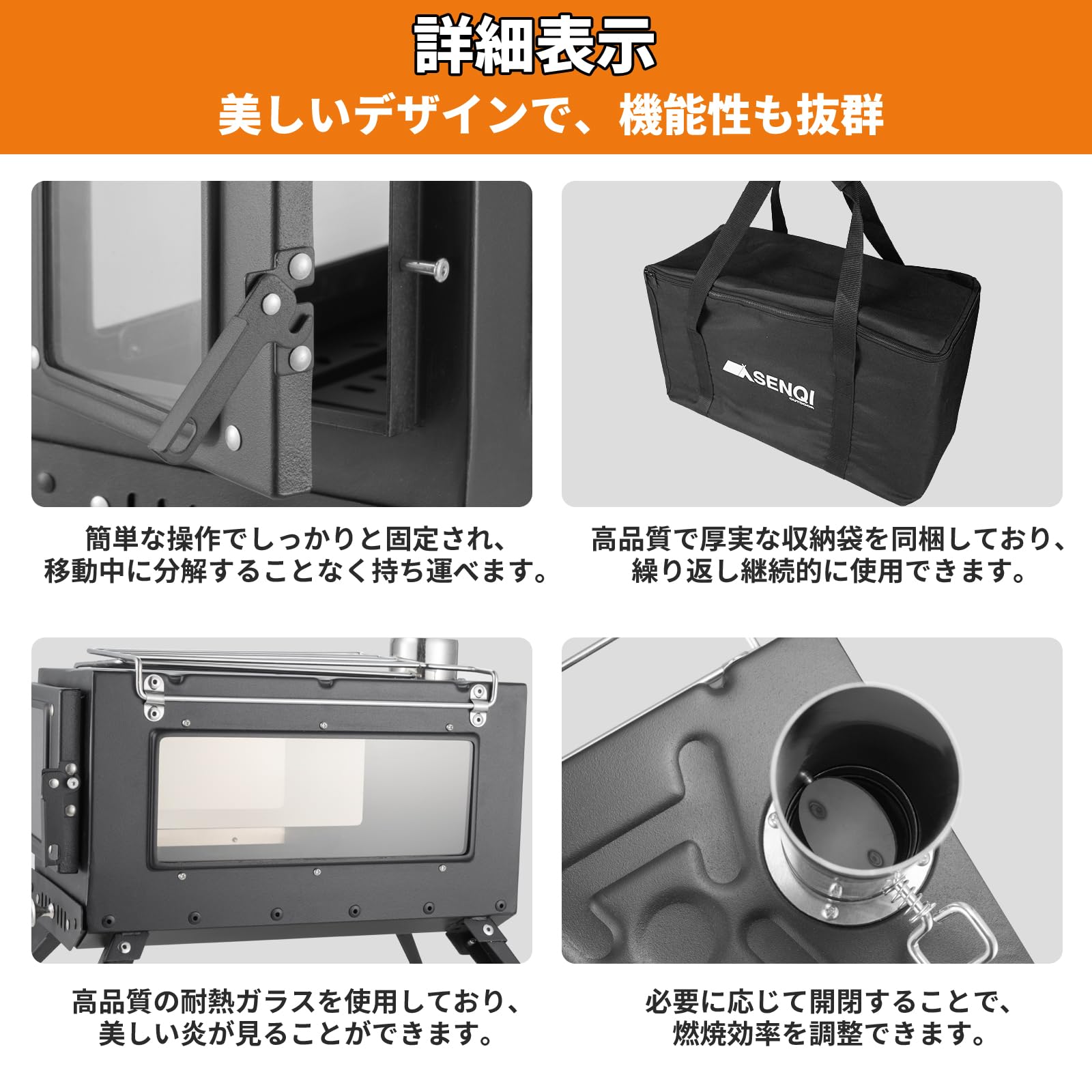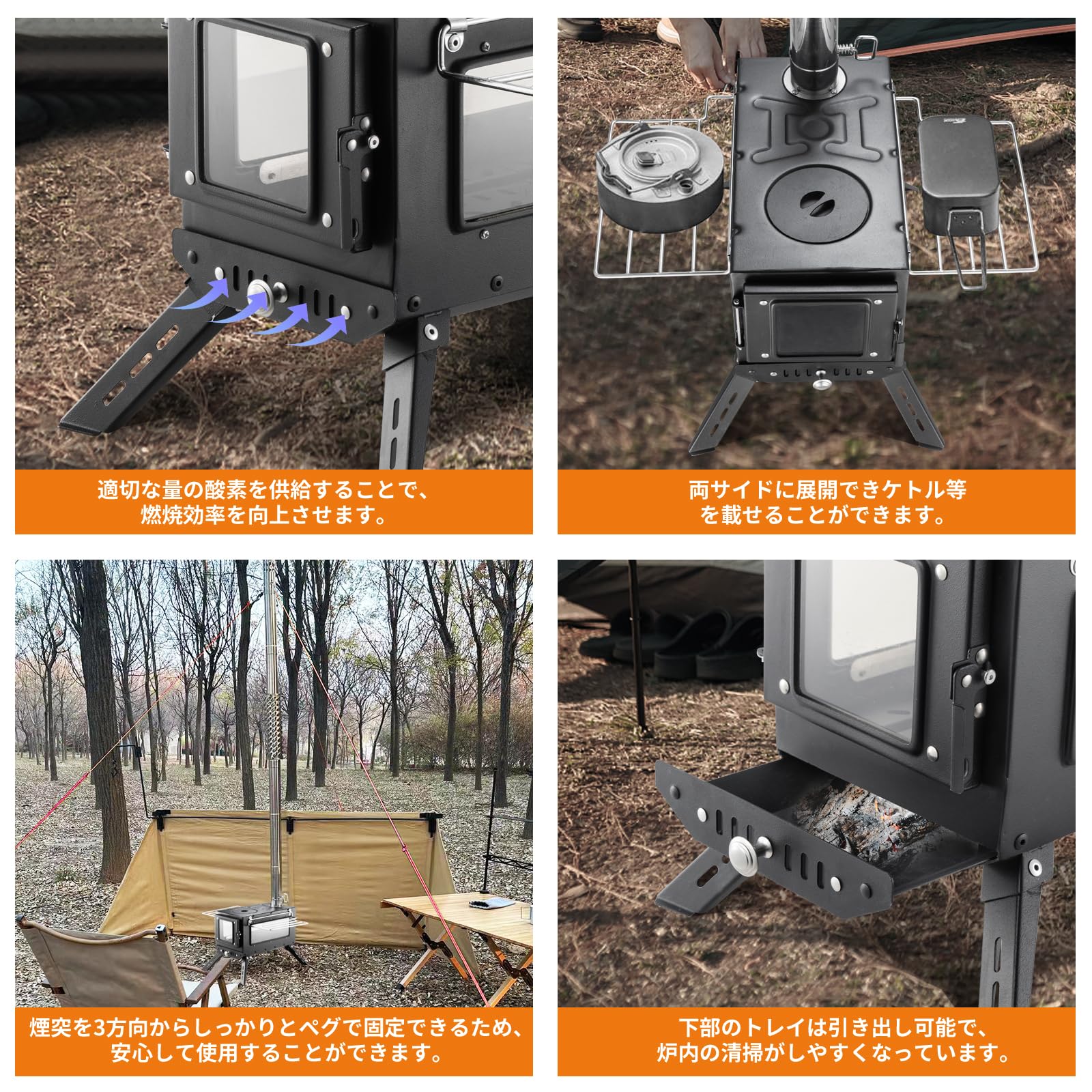 【細部までのデザイン】1. 煙突先端部に火の粉の飛び散りを抑えるスパークアレスターを搭載しています。2. 煙突を3方向にしっかり固定できるロープとカラビナが同梱し、風が強い日もお使いいただけます。3. ドアの空気調整口と煙突のスイッチで火力調整がしやすい。4. 長さ26cmの薪に対応できます。