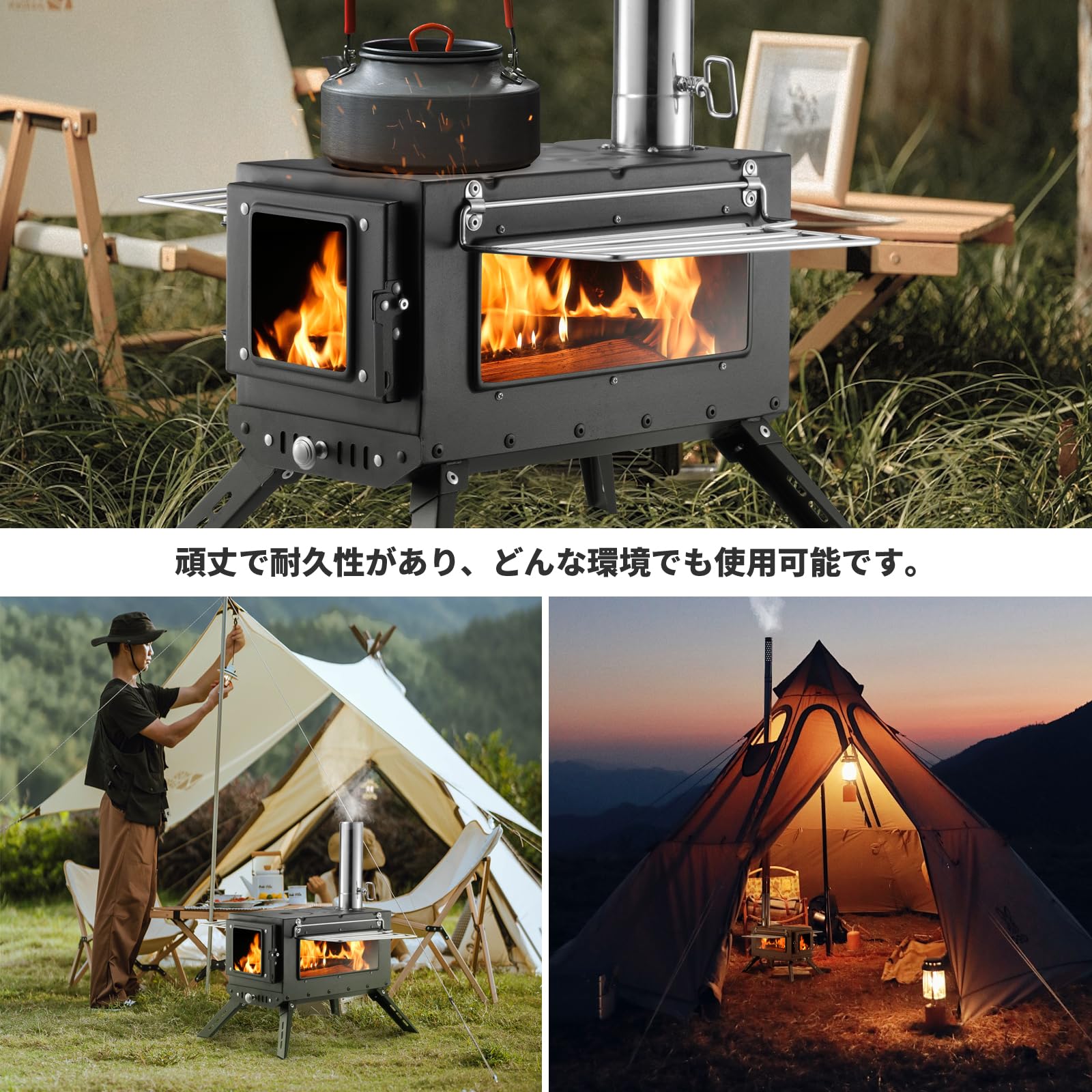 【多用途】大きなストーブ天板でその上に調理器具(鍋、フライパンやヤカンなど)を載せ、解凍、加熱、保温、お湯沸しや簡単な料理を作ることができます。冬キャンプでテント用暖炉、テント中での調理用コンロ、焚き火台、卓上薪ストーブや煙突付き小型薪ストーブ、万が一の防災用品としても使えます。