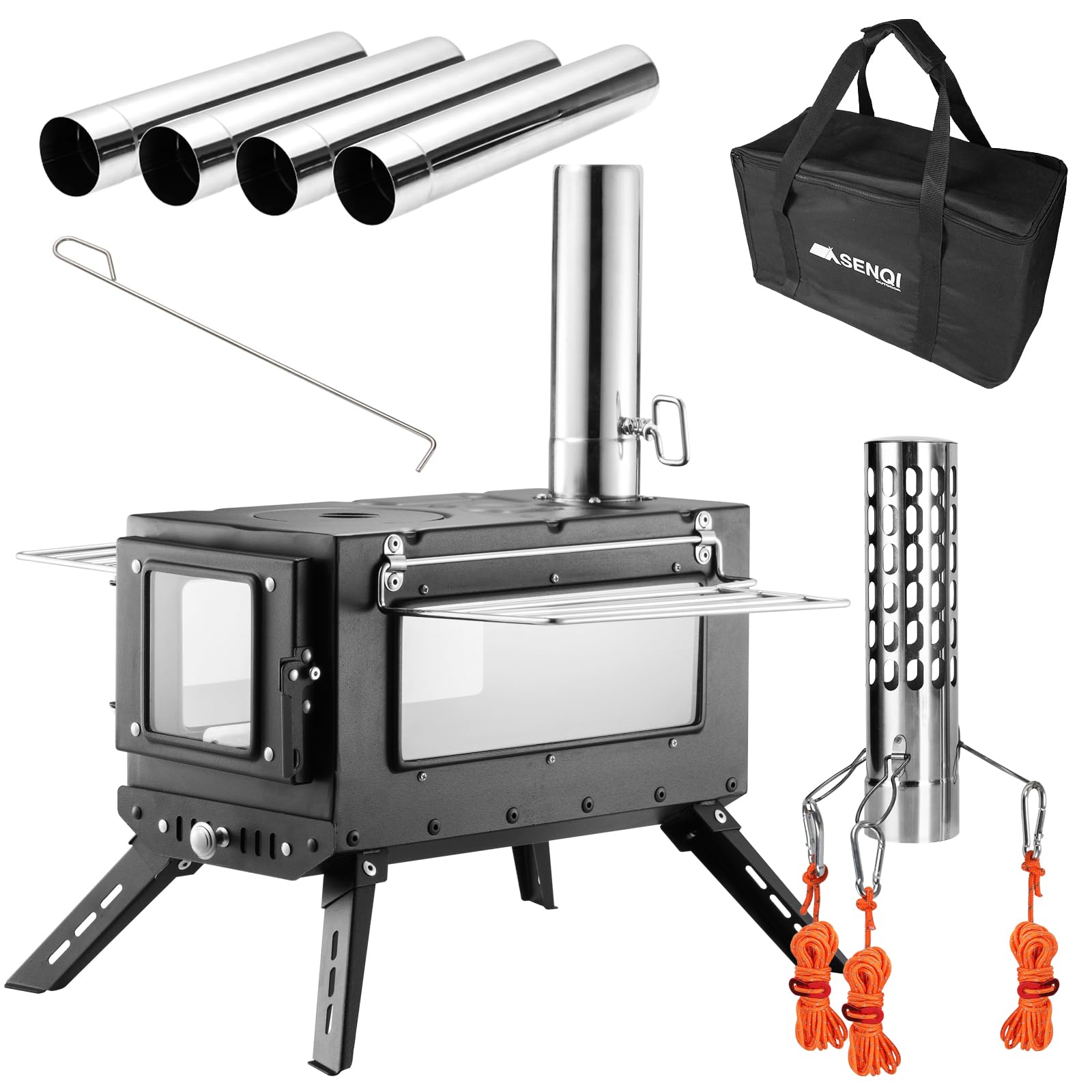 SENQI 薪ストーブ キャンプ テント コンロ ステンレス 折りたたみ式 煙突・耐熱ガラス窓・グリッド棚搭載 携帯便利 ウード暖炉 焚き火台 テント調理 キャンプヒーター アウトドア キャンプ 収納袋付き