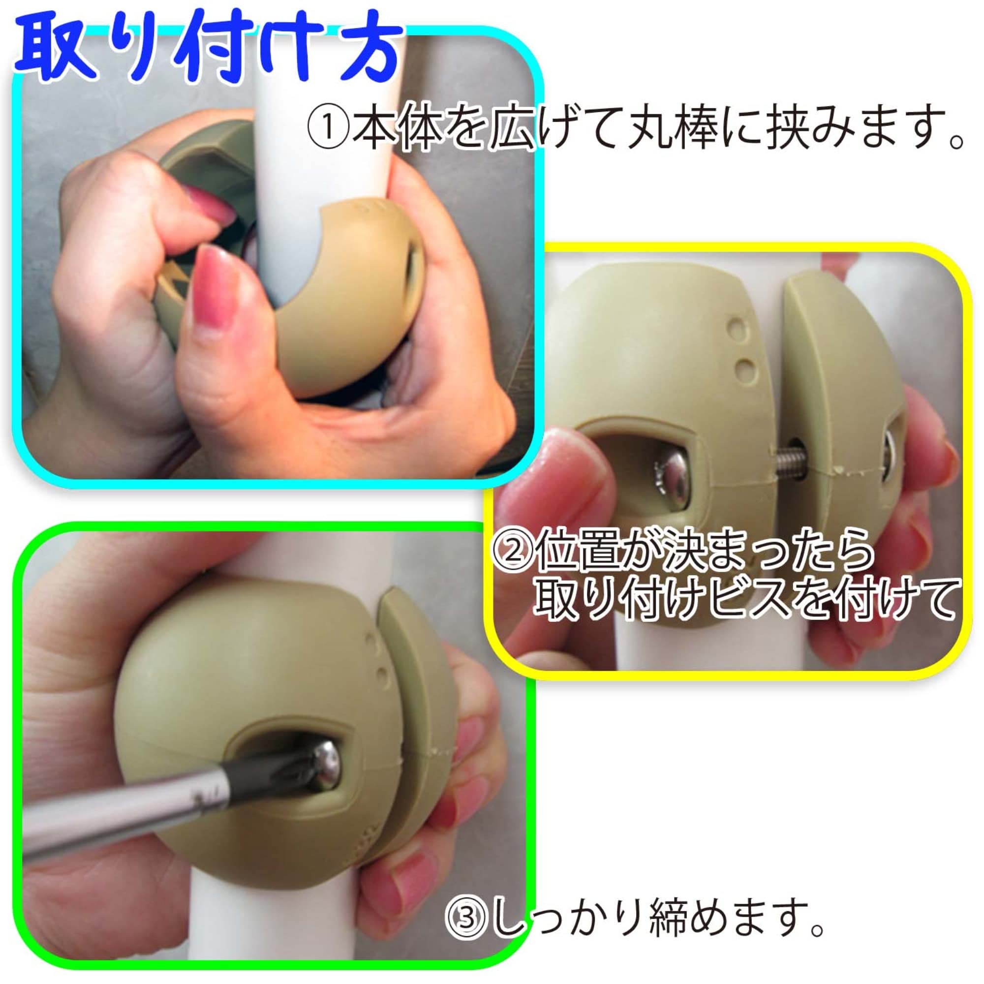 ●手すり丸棒にハサんで、ビスで締めるだけなので、キズをつけないでドライバー1本で簡単に取付けできます。