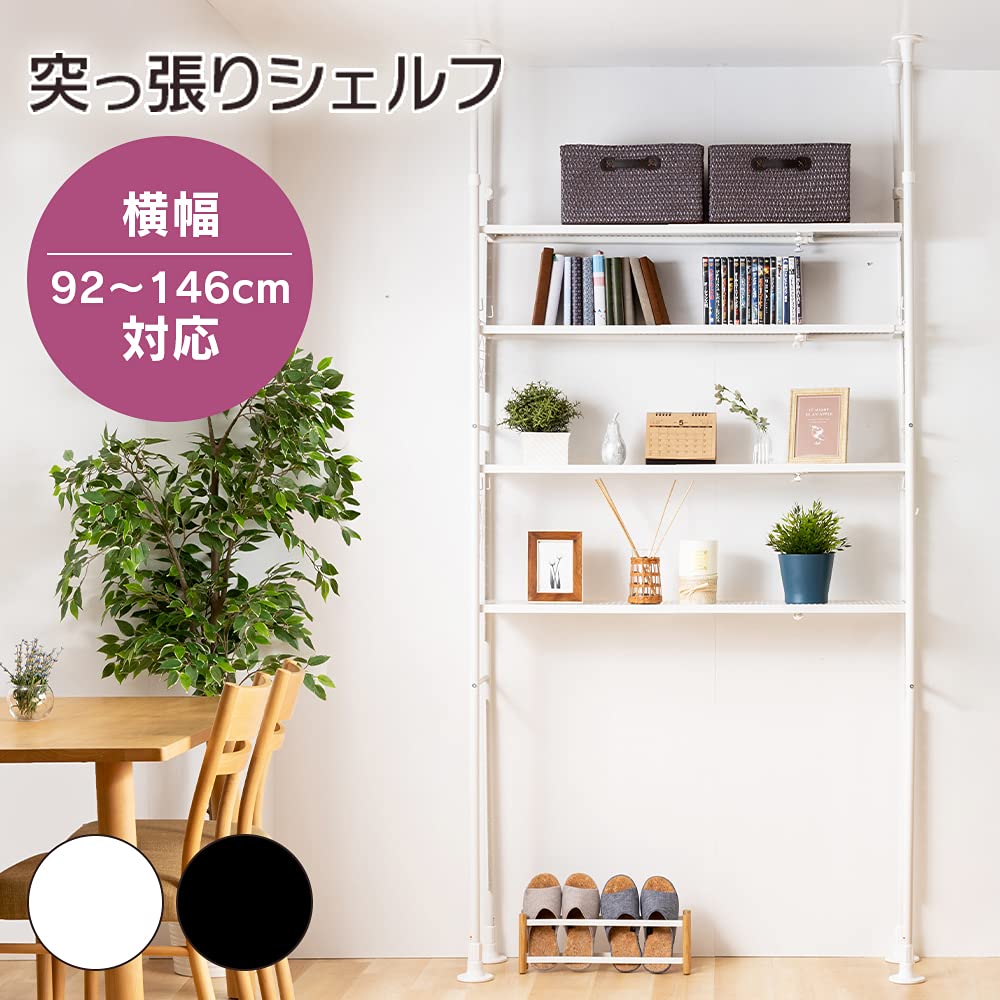 【洗濯機上の棚にも】アイリスプラザ 棚 ラック 伸縮 突っ張り フック×16個付き 可動棚×4 幅92~146㎝ 天井210~260㎝対応 T耐荷重各10kg SSH-9235 ホワイト