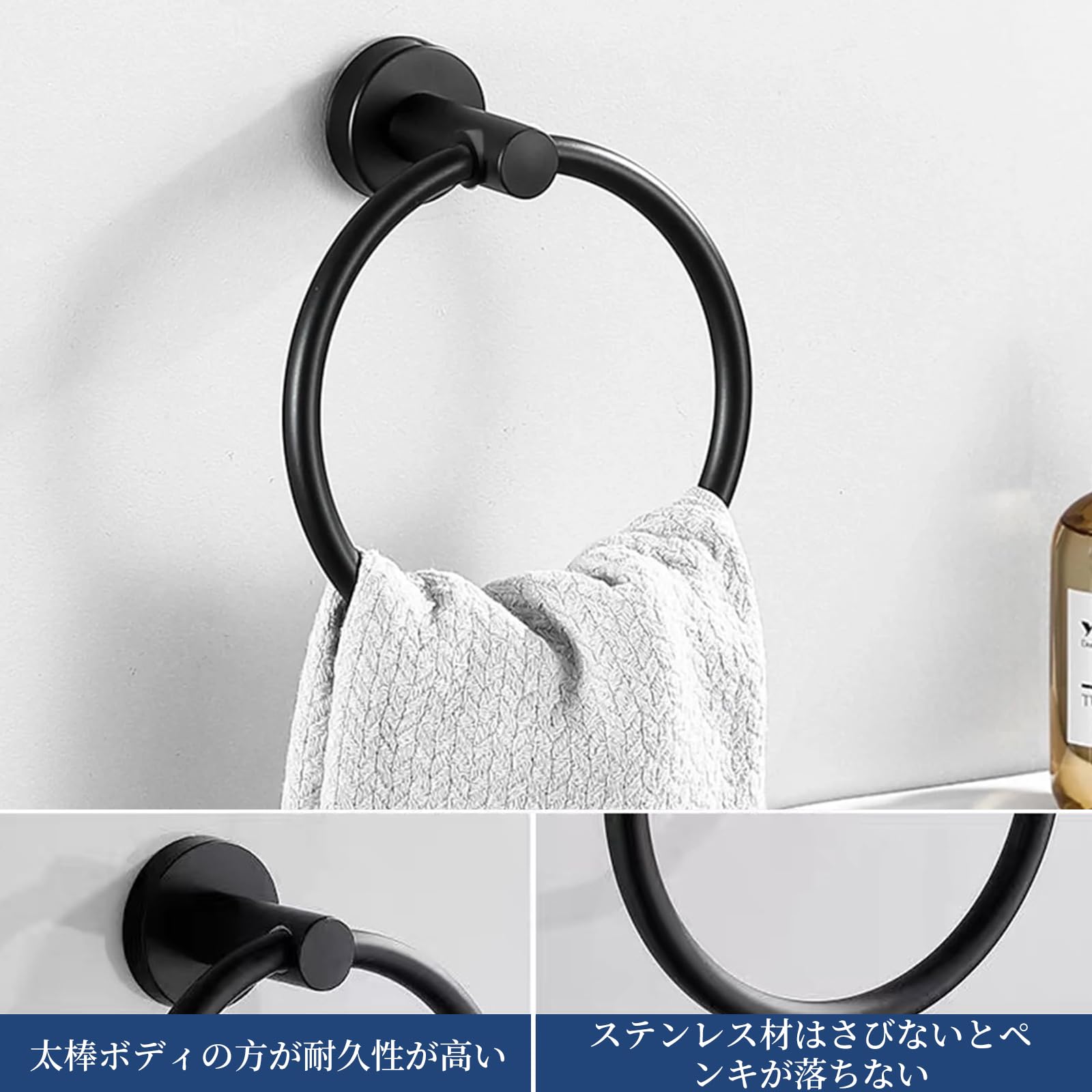 ?【エレガントなデザインと使いやすさ】 :このタオルリング(ラック)は、シンプルなマットな質感のデザインを採用し、クラシックとモダンなスタイルを兼ね備え、さまざまなインテリアスタイルにぴったりです。そのユニークな形状のおかげで、タオルのかけ外しが簡単で、脱落しにくく、日常生活に快適さと利便性をもたらします。