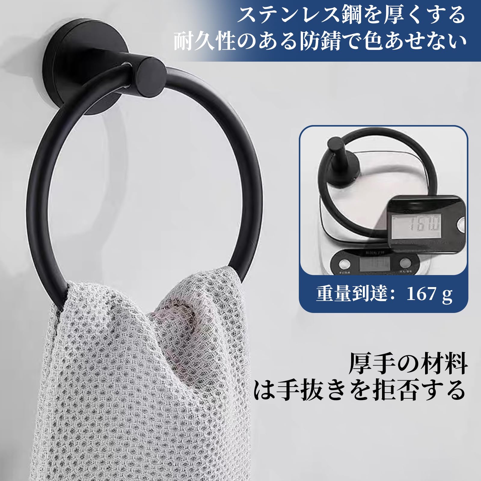 ?【ブラックの魅力と心遣いのあるサービス】 :このタオルリング(ラック)はブラックのみを提供しており、どんなインテリアスタイルにもぴったりと馴染み、重厚感と高級感をプラスします。製品には分かりやすい取り扱い説明書が付属しており、図解入りで説明が?しいため、取り付けが楽々と行え、快適な使用体験をお楽しみいただけます。