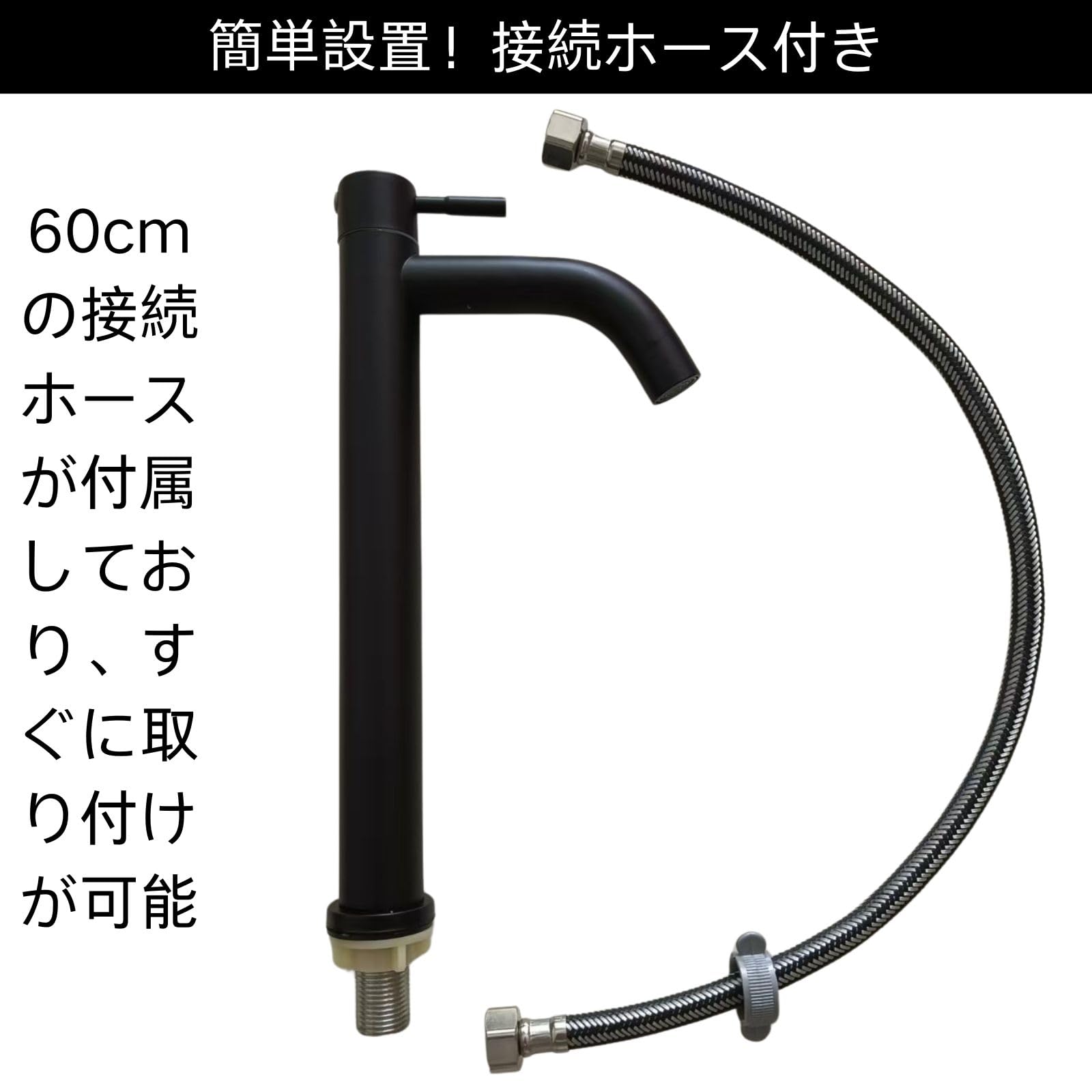 簡単設置!接続ホース付き:60cmの接続ホースが付属しており、すぐに取り付けが可能。リフォームや新築工事に最適です。