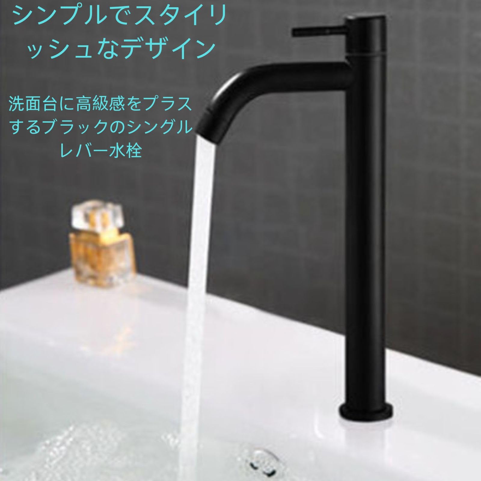 シンプルでスタイリッシュなデザイン:洗面台に高級感をプラスするブラックのシングルレバー水栓。オシャレな洗面空間を演出します。