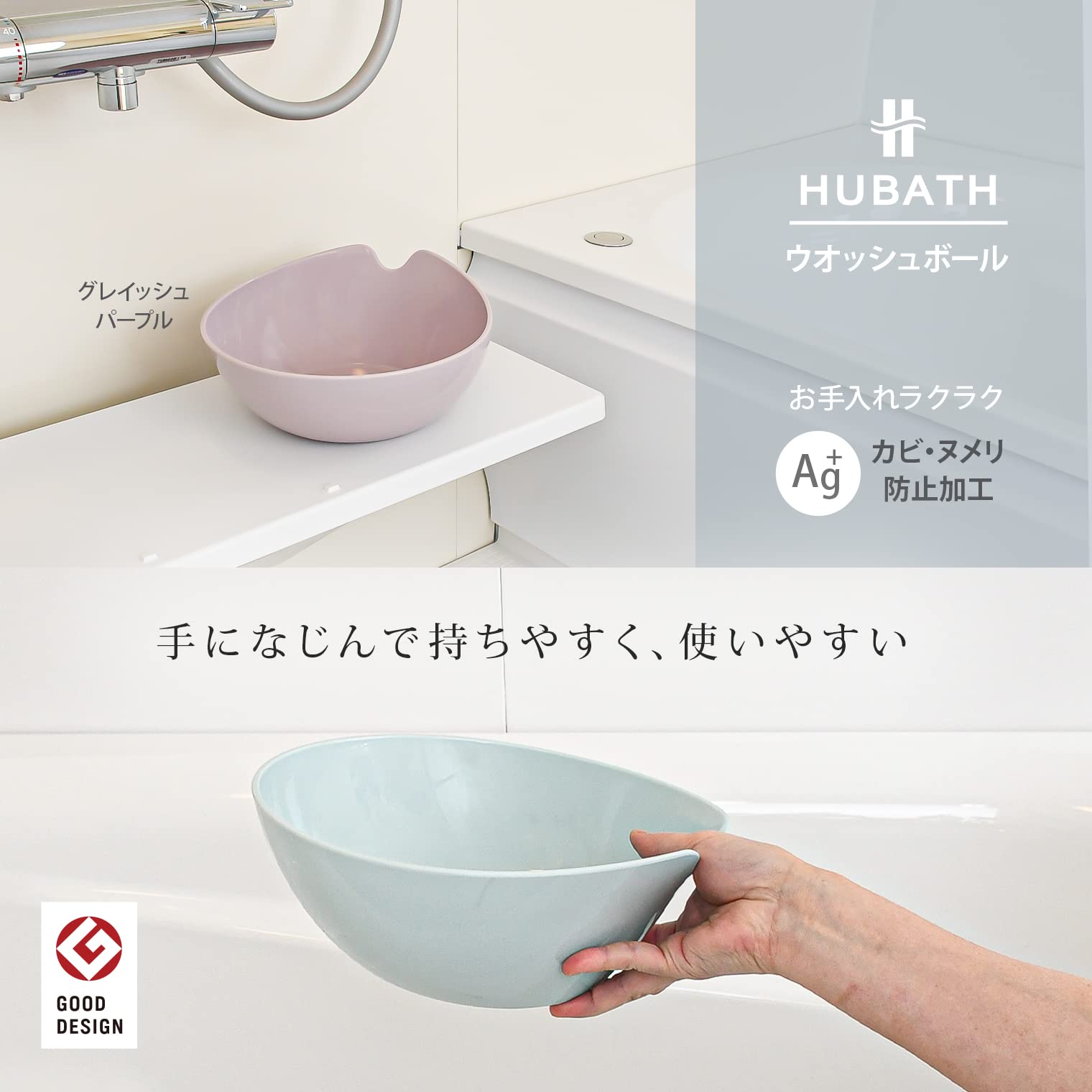 ちょうど良いいかも。そんなやさしい形です。HUBATH(ヒューバス)シリーズ。 ☆滑らかな折り返しのないかたちは、汚れがつきにくく、またカビ防止加工が施されていますので、日々のお手入れが簡単です。 ☆持ちやすさにもこだわって持ち手部分に切り 込みをいれ、もちやすいかたちに仕上げました。 ☆収納にも一工夫。同シリーズの手桶とキレイにかさねあわせ収納いただけます。