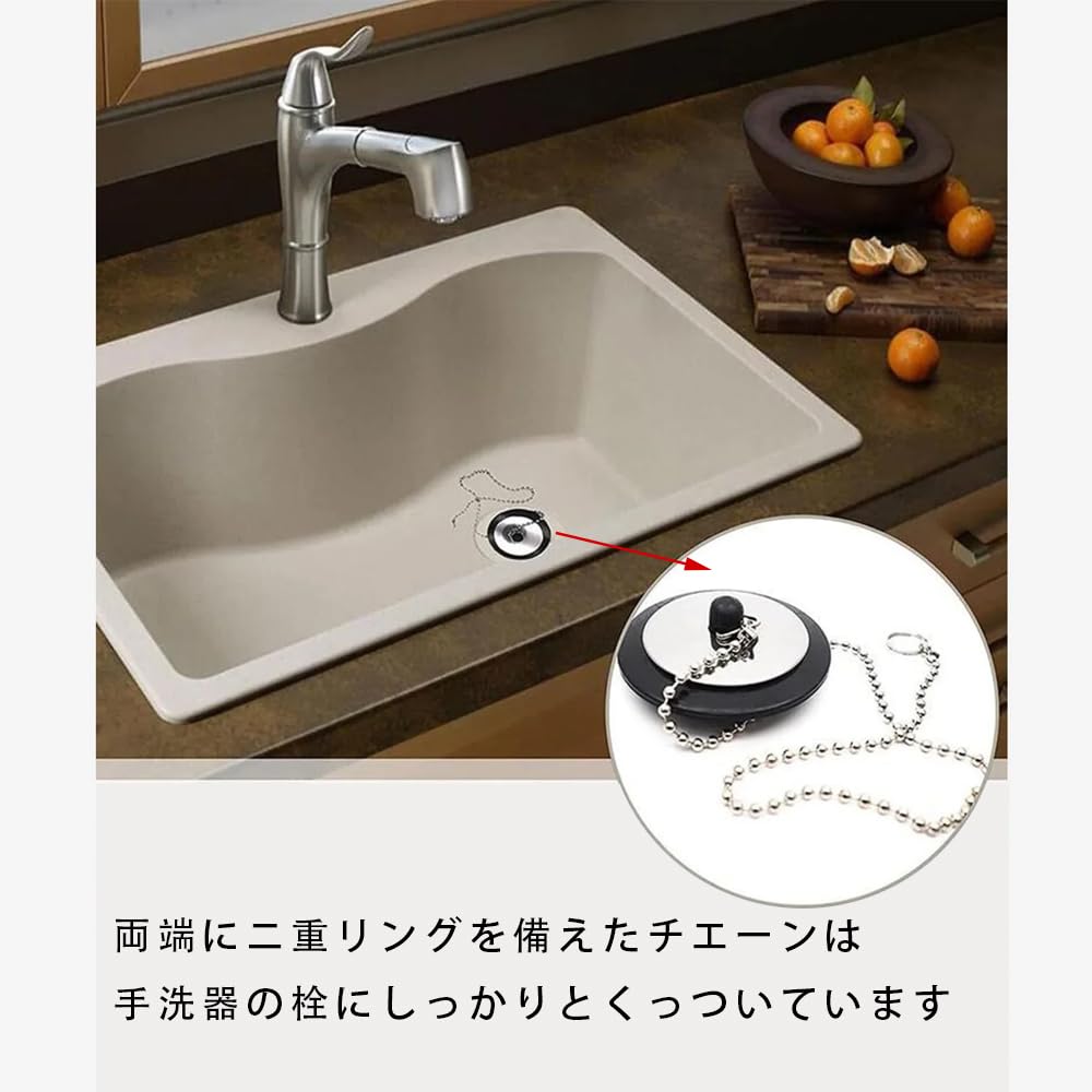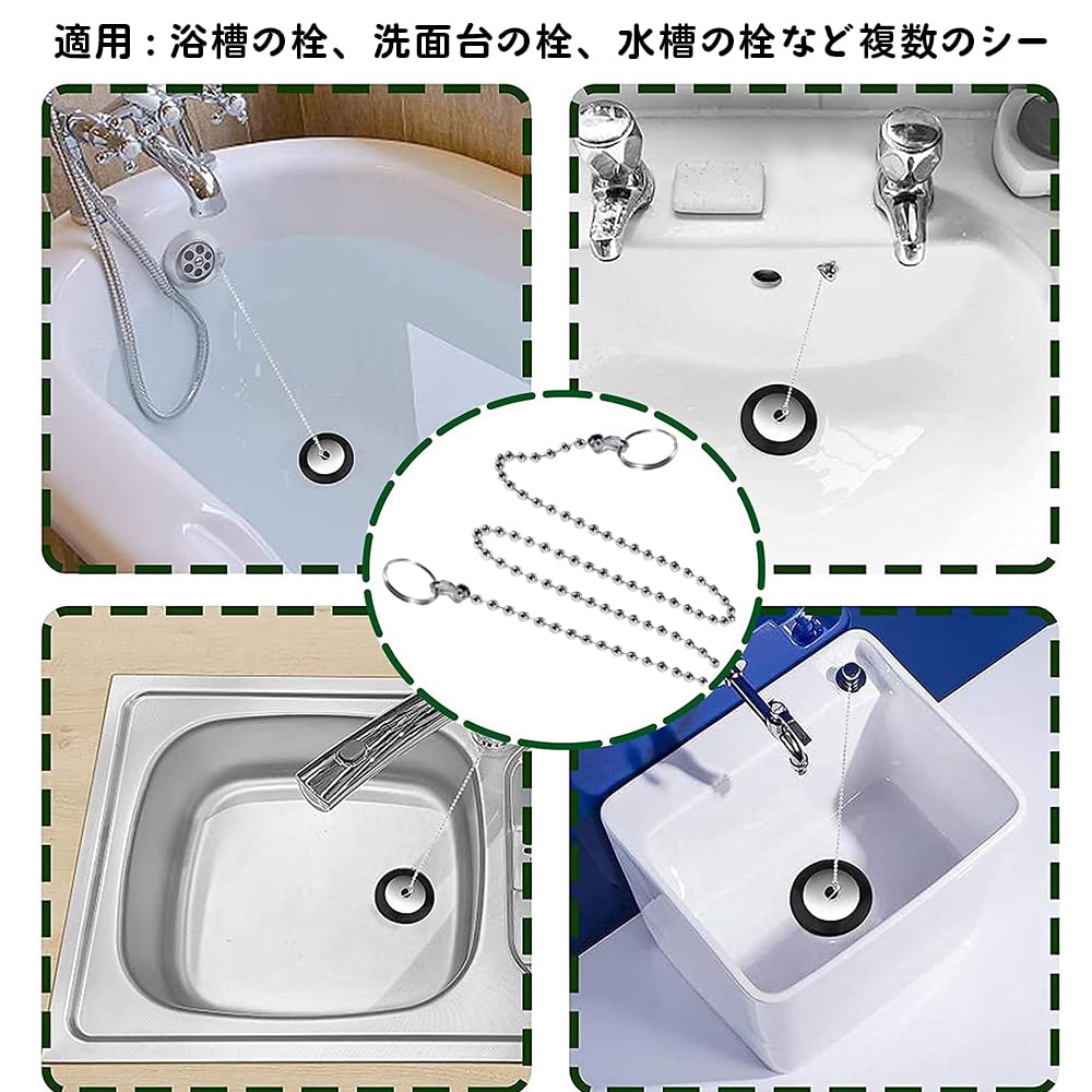 1.【67cmのビーズチェーン付き】 付属の67cmのステンレスビーズチェーンは、排水栓を水道栓に取り付けて紛失を防ぎ、簡単に取り外しができる便利なデザインです。水を抜く時にはチェーンを引っ張って簡単に使用できます。 2.【高品質ステンレス製で耐久性抜群】 風呂栓チェーンは304ステンレス鋼製で、耐久性に優れています。長時間水に触れても錆びにくく、耐腐食性が高いため、長期間にわたり使用できます。二重リング付きで、しっかりと取り付けが可能です。 3.【使い勝手が良い便利な設計】 バスタブ用ストッパーに取り付けられたステンレス製の670mmボールチェーンにより、使うときに排水栓を簡単に見つけて引き抜くことができます。使用しないときはフックに掛けて保管できます。チェーンは304ステンレス製で、錆びにくいです。 4.【丈夫で耐久性】 排水栓はしっかりと密閉され、軽量で強力。簡単に落ちることなく、触り心地も滑らかで、掃除が簡単です。 5.【幅広い適用範囲】 キッチン、バスルーム、プール、ランドリー、スロップシンクなど、多様な場所で活躍します。屋内外問わず使用可能で、便利で実用的なソリューションを提供します。
