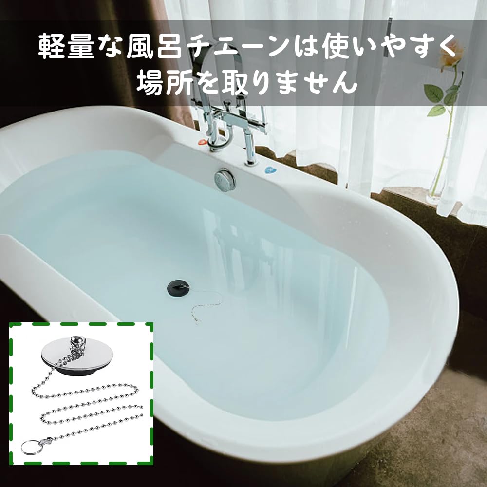 【使い勝手が良い便利な設計】 バスタブ用ストッパーに取り付けられたステンレス製の670mmボールチェーンにより、使うときに排水栓を簡単に見つけて引き抜くことができます。使用しないときはフックに掛けて保管できます。チェーンは304ステンレス製で、錆びにくいです。