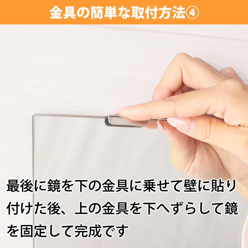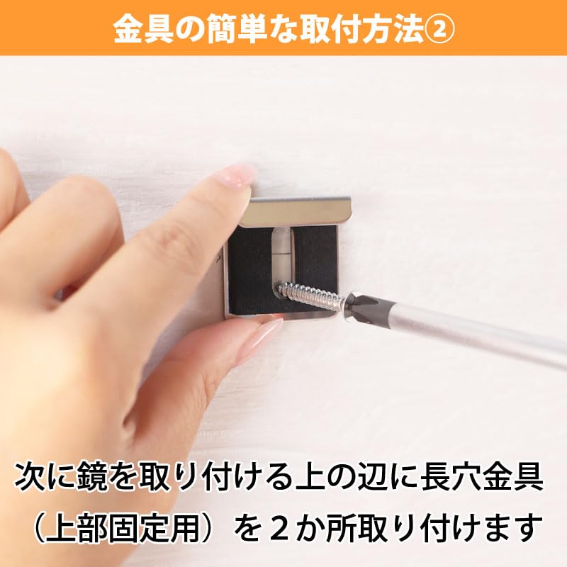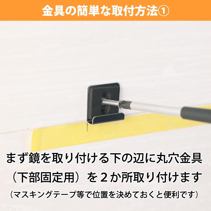 【簡単取付でDIY対応】 下部に「丸穴金具」×2、上部に「長穴金具」×2を設置し、鏡を下から乗せて上から押さえるだけ。ドライバー1本で施工可能です。