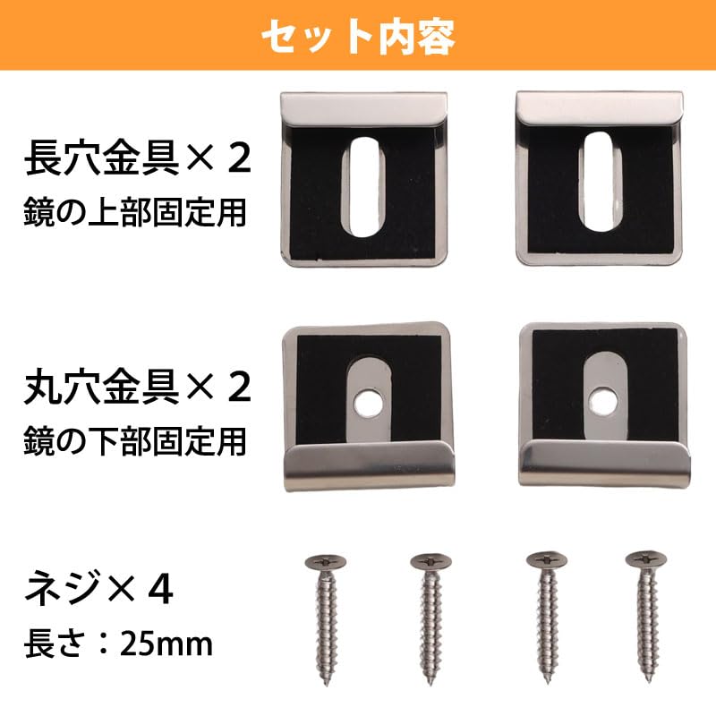 【4mm厚鏡に対応(3mm厚鏡にも代用可)】 本商品は「4mm厚・糸面取り加工(1mm幅)」の鏡専用の取付金具セットです(日本製)。5mm厚の鏡には適合しません。※本商品は金具のみです。鏡本体は付属しておりません。