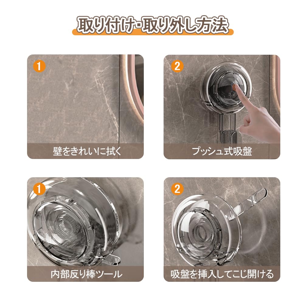 再利用可能: このフックは簡単に取り外せるだけでなく、何度も再利用できます!再取付の前に、吸盤をぬるま湯で洗うだけで、優れた吸着力を回復し、長持ちで耐久性のある便利さを提供します。