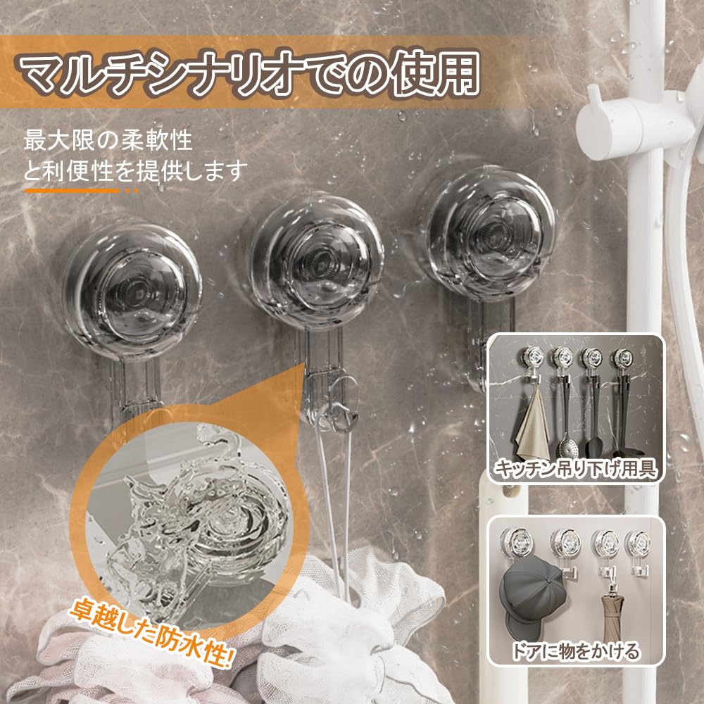 防水設計: 優れた防水性能を備えたこのフックは、バスルームやキッチンなどの水気の多い環境での使用に最適です、水蒸気が多い状況でも、しっかりと固定でき、落ちにくいので、長期間安定した吊り下げサポートを提供します。