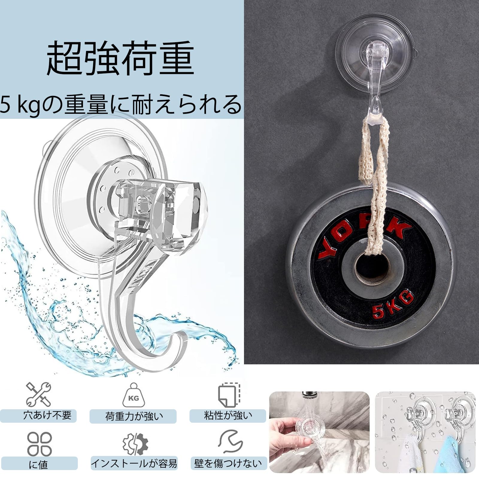 【優れた耐水性】 吸盤 フック 強力はPVC素材を使用しており、耐久性に優れ、水に濡れても安心です。防水性に優れ、湿気の多い浴室でも安心して使える防水吸盤フックです。 接着場所を変える場合は、お湯に浸して乾かせば何度でも使用できるので、使いやすい商品です。