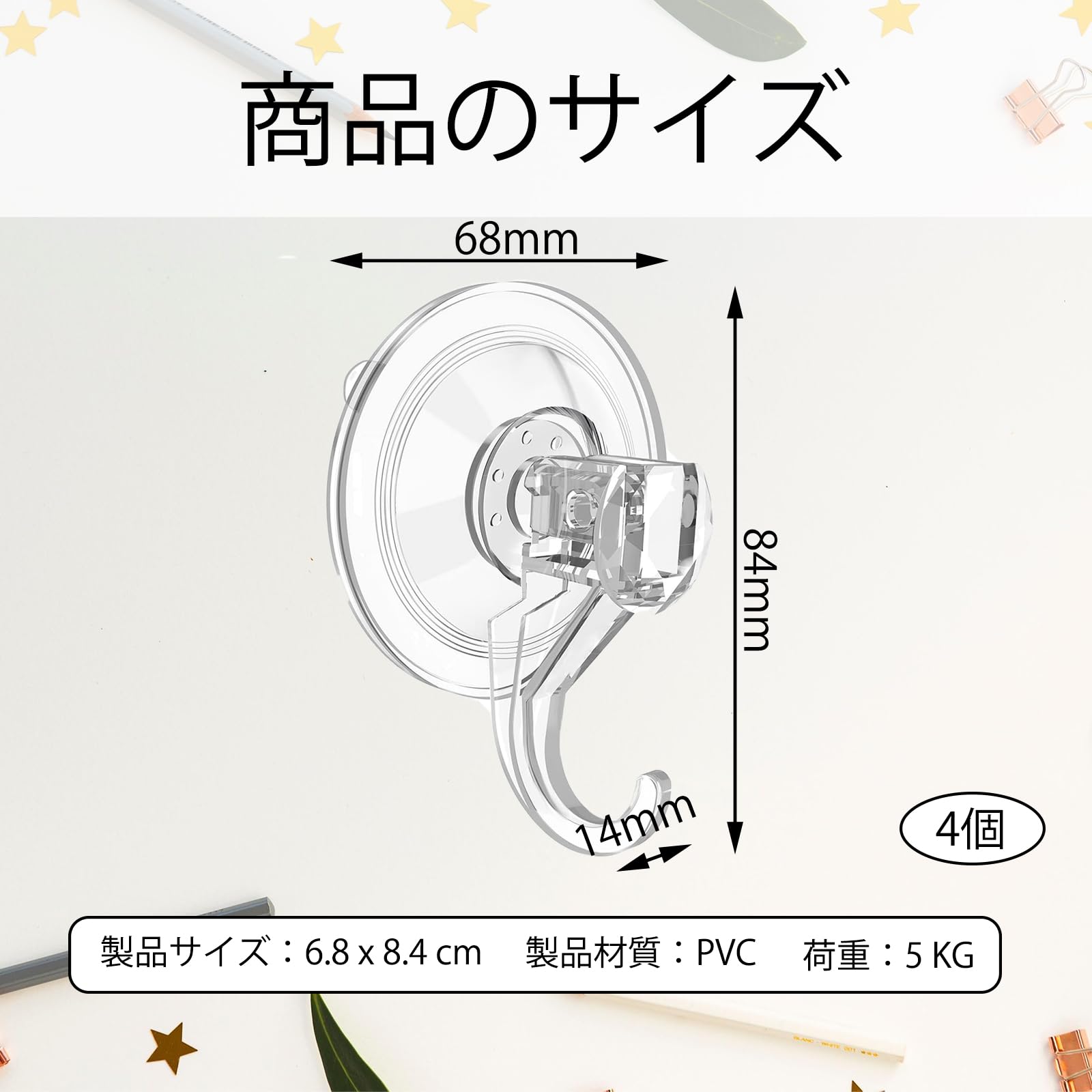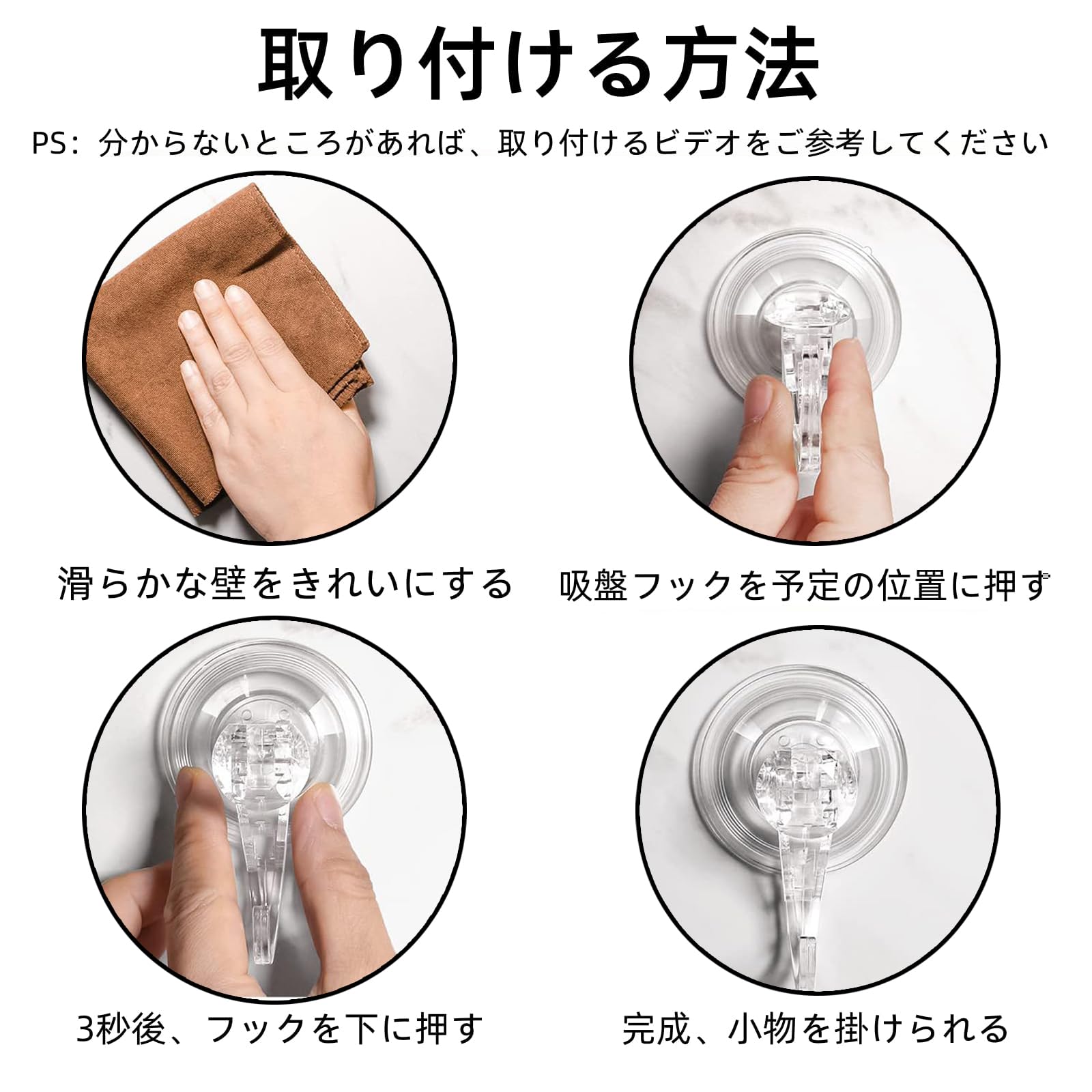 【セット内容】 吸盤 フックサイズ:68*84mm 材質:PVC 耐荷重:5kg カラーからー:透明とうめいと セット内容:吸盤フック*4個, 模様のあるタイル、壁紙、木など凹凸のある表面には貼らないでください。