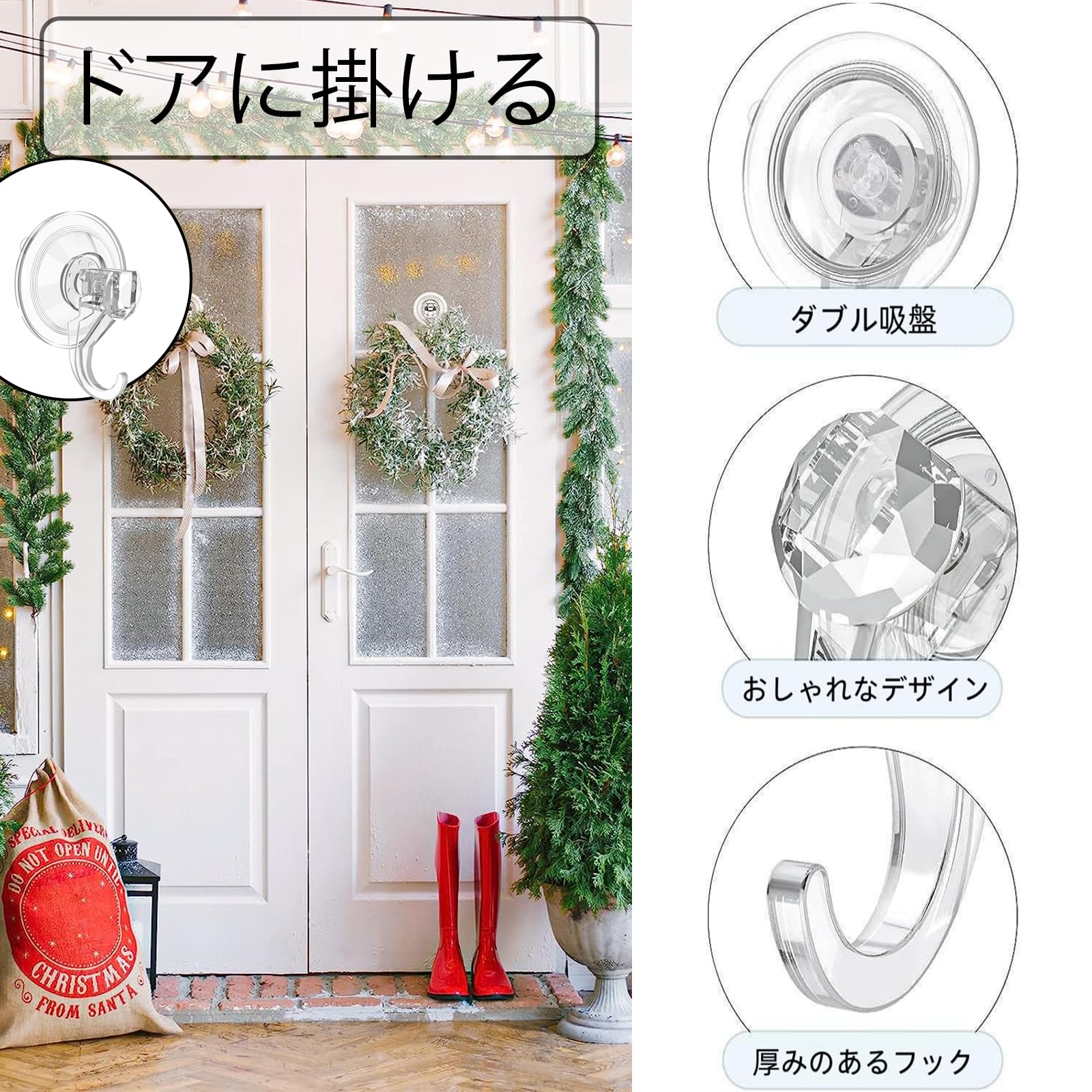 【繰り返し使用可能】 吸盤 フック取り付け手順は非常に簡単で、壁に穴を開けたり接着剤を塗布したりする必要はなく、壁をきれいに拭き、吸盤フックを押し付けてフックを押すだけです。 壁を傷つける心配がなく、簡単に分解できます。使用前に洗って乾燥させることができます。
