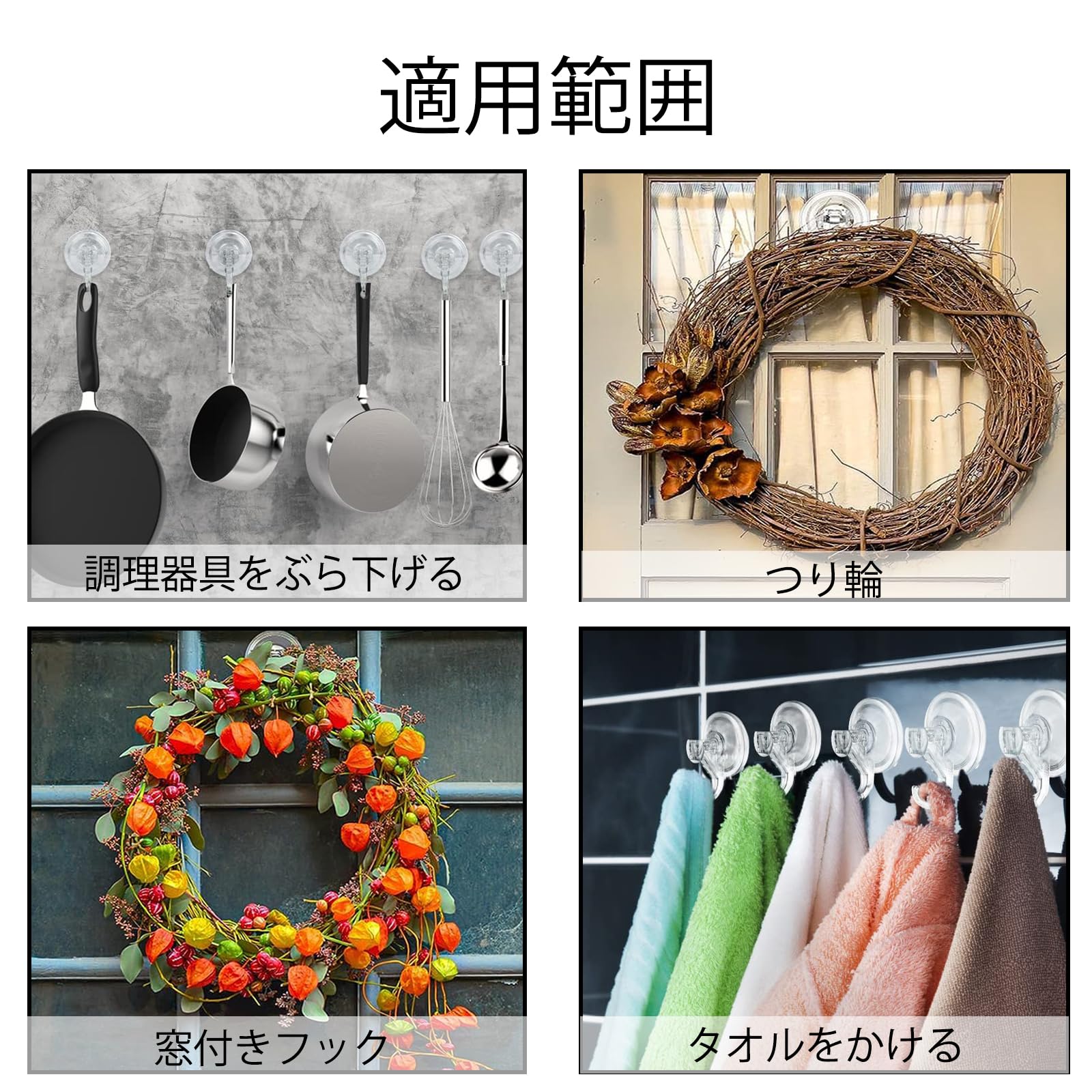 【適用範囲】 この吸盤フックは、バスルームに吊り下げてバスアメニティを掛けるだけではありません。 キッチンや寝室など他の部屋に吊るして他の雑貨を掛けることもできます。家のどこにでも吊るすことができ、非常に便利です。