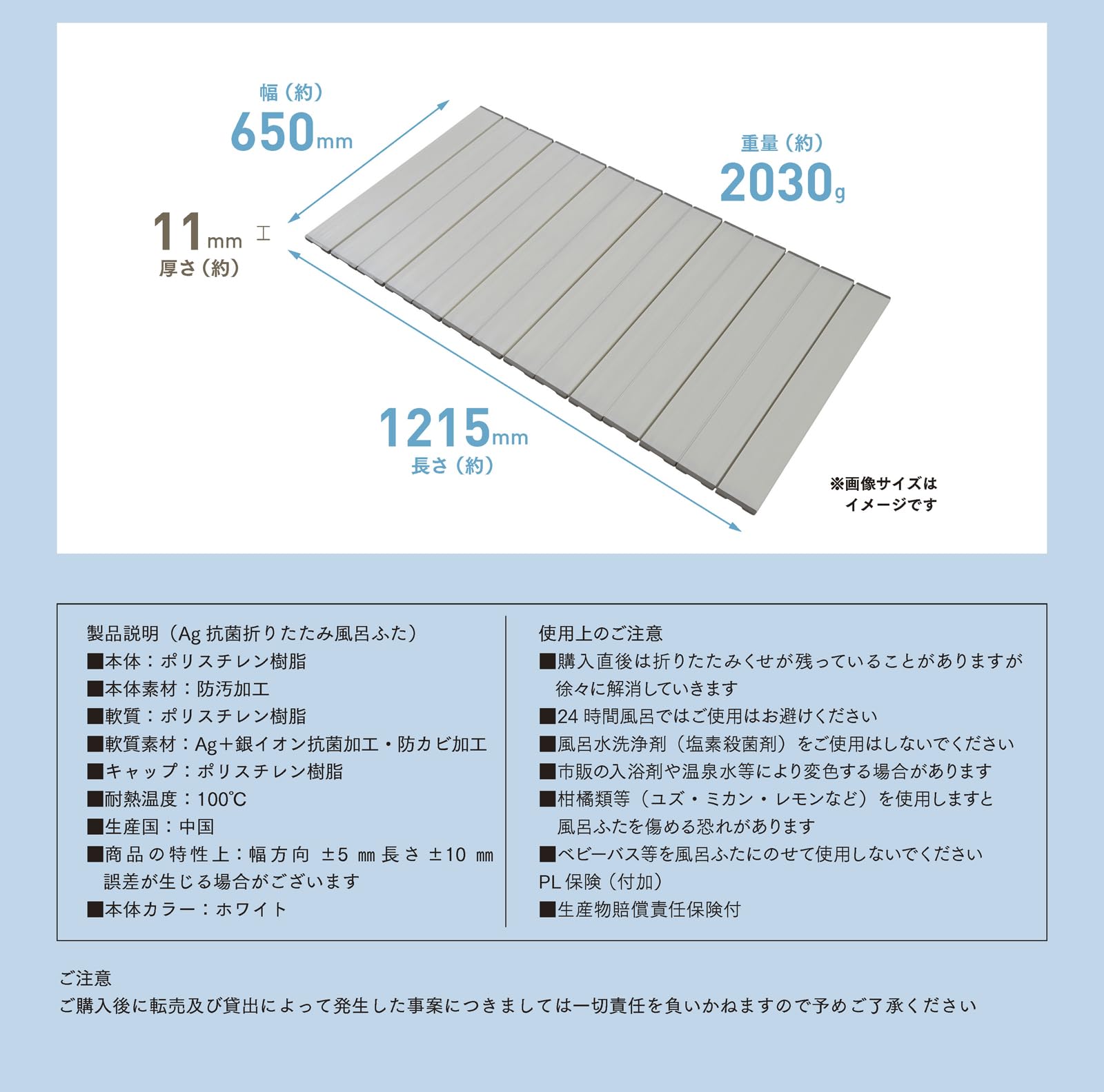 色:ホワイト | サイズ:65×121.5cm■使い始めに素材特有のにおいがする場合がありますが、気になる場合は陰干しなど日陰に放置しにおいが消えてからご使用ください ■風呂ふたを洗う時には中性の浴槽洗剤をご使用ください■汚れ落としに塗料用のシンナー、塩素系の洗剤、漂白剤、カビ取り剤、および歯磨き粉、固いたわし等は、風呂ふたを傷めますので絶対にし使用しないでください■いつも濡れたままの状態ではカビが発生しやすくなります。ときどき陰干しをしてください■一部の入浴剤や温泉水等により変色する場合がありますのでご注意ください■風呂水洗浄剤(塩素殺菌等)、浴室用洗剤(アルカリ性等)によって風呂ふたが傷んだり、変色、劣化しますので使用しないでください■塩素系殺菌、浴槽水浄化保温装置(24時間風呂)にご使用されますと風呂ふた表面の荒れ、退色などの変化を生じるおそれがありますので、ご使用をお避けください■風呂ふたの上にベビーバスなどをのせて使用するのは大変危険です絶対にやめましょう