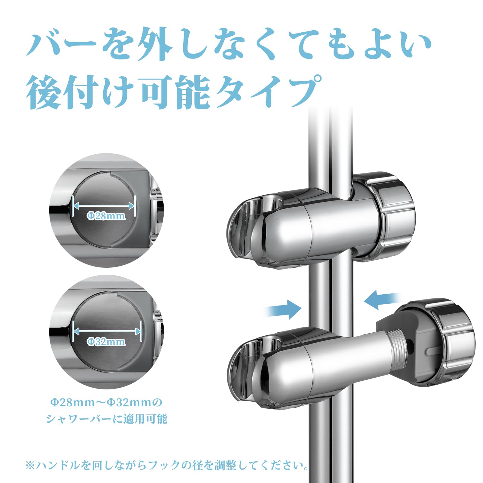 [取付簡単] バーを外しなくても取付できる後付けタイプです。ハンドルを軽く回して固定部をバーに合わせて設置できます。直径28mm〜32mmのスライドバーに適用します。ご注文の前はスライドバーの直径をご確認ください。(直径の測定方法:スライドバーの直径=(スライドバー)周囲/π)。