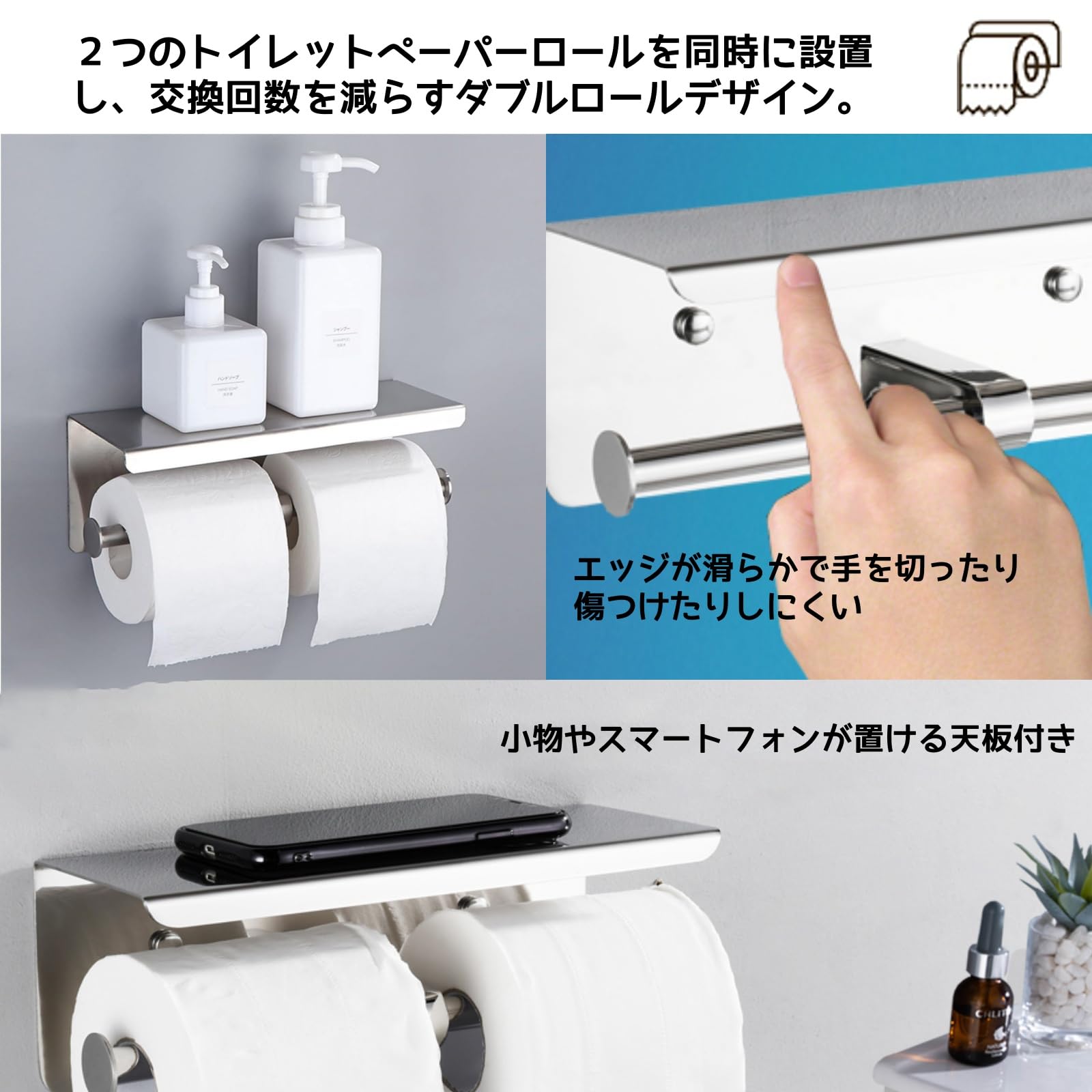 【数量限】トイレットペーパーホルダー ダブルタイプ 2連 天板付き ステンレス 壁掛け 紙巻器 賃貸 DIY おしゃれ ペーパー ホルダー 壁取り付けネジ付き 小物置き バスルーム&キッチン用 簡単設置 (シルバー - トイレットペーパーホルダー 2連)